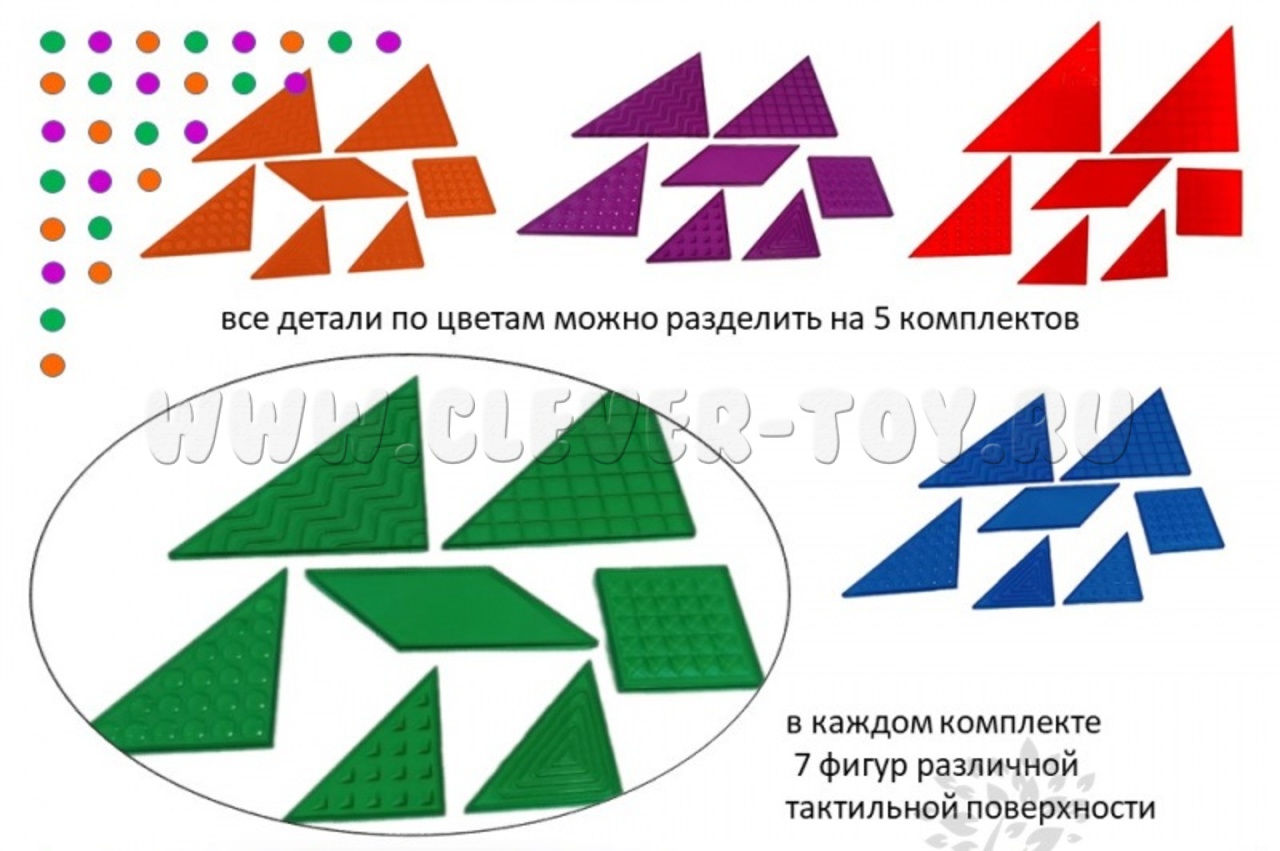 В комплект входят 35 тактильных фигур в 5-ти ярких цветах (7 различных тактильных поверхностей).