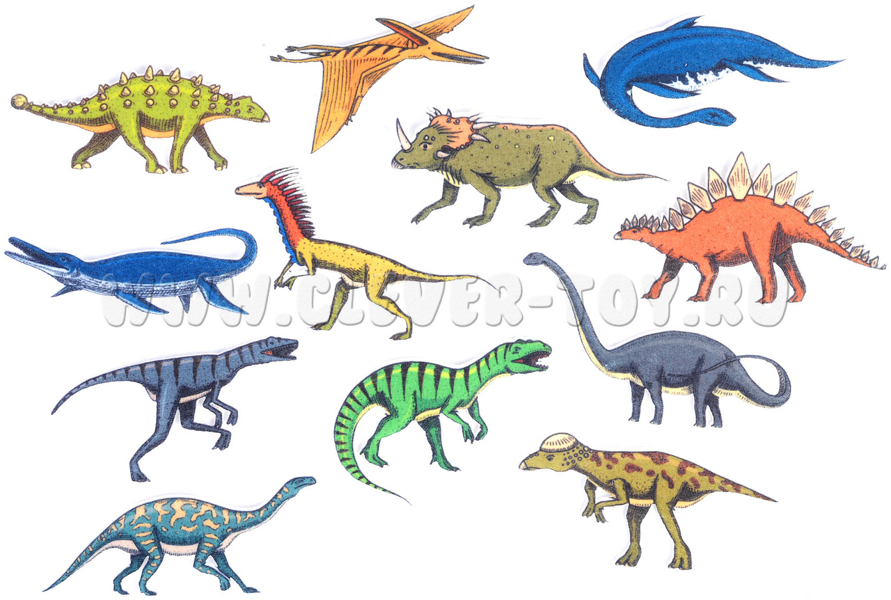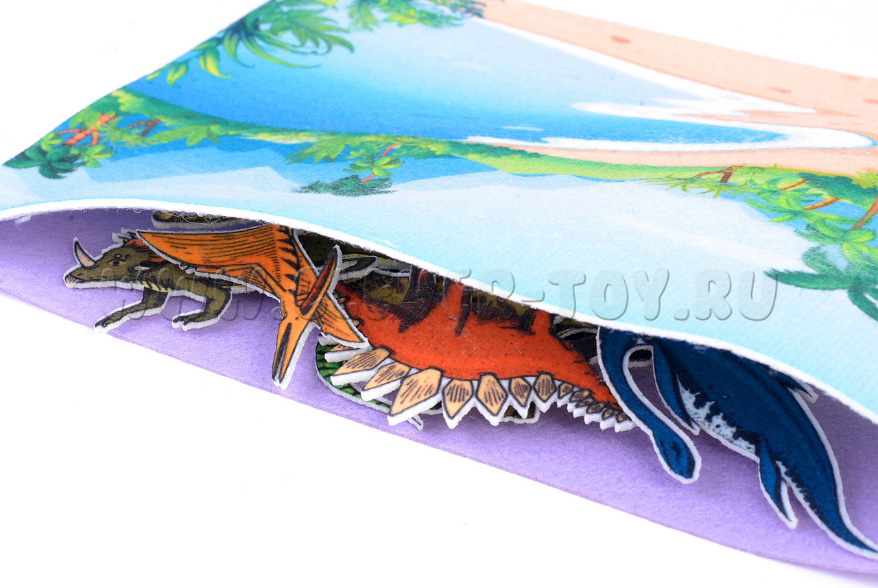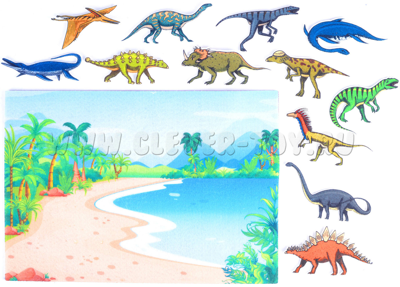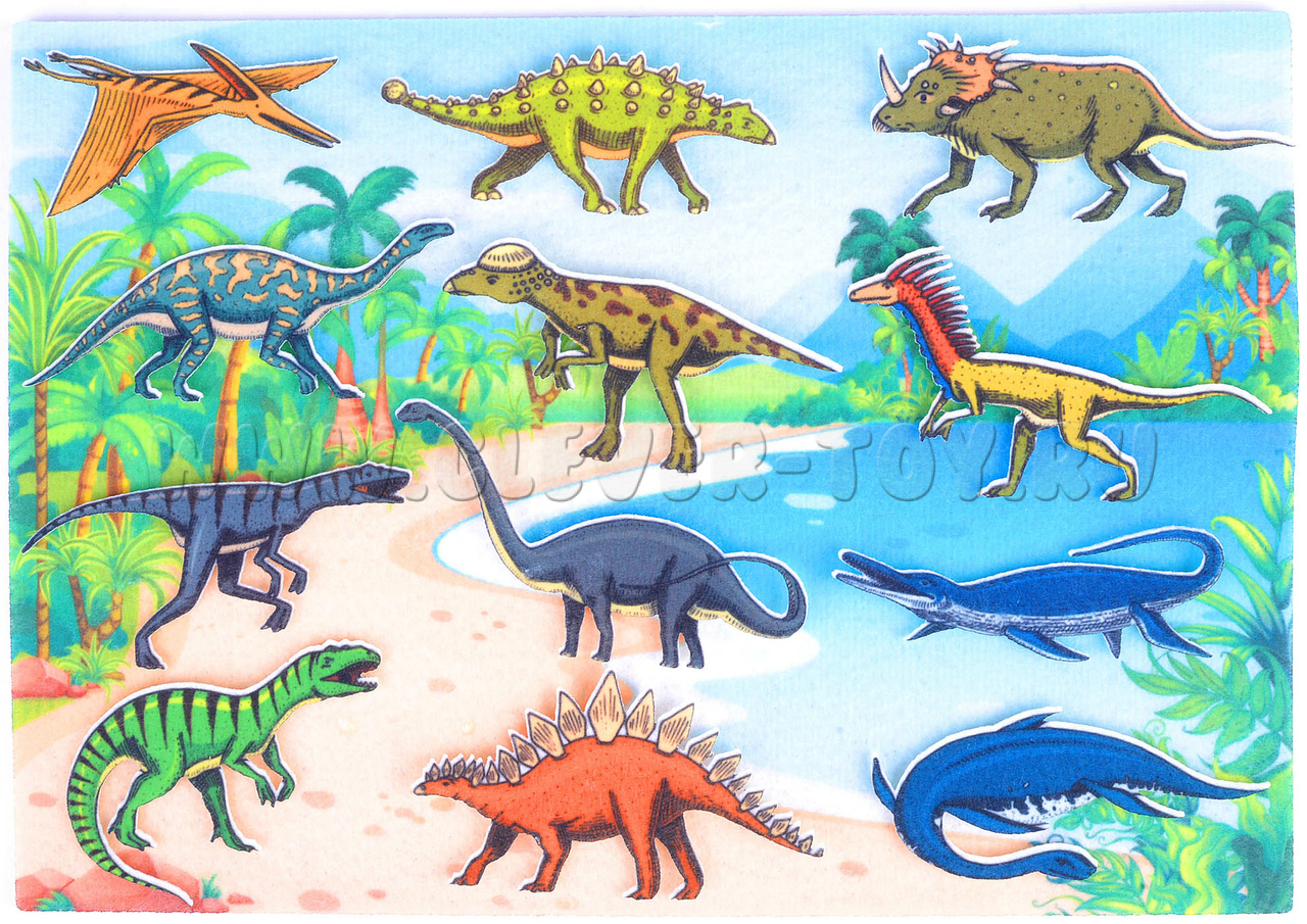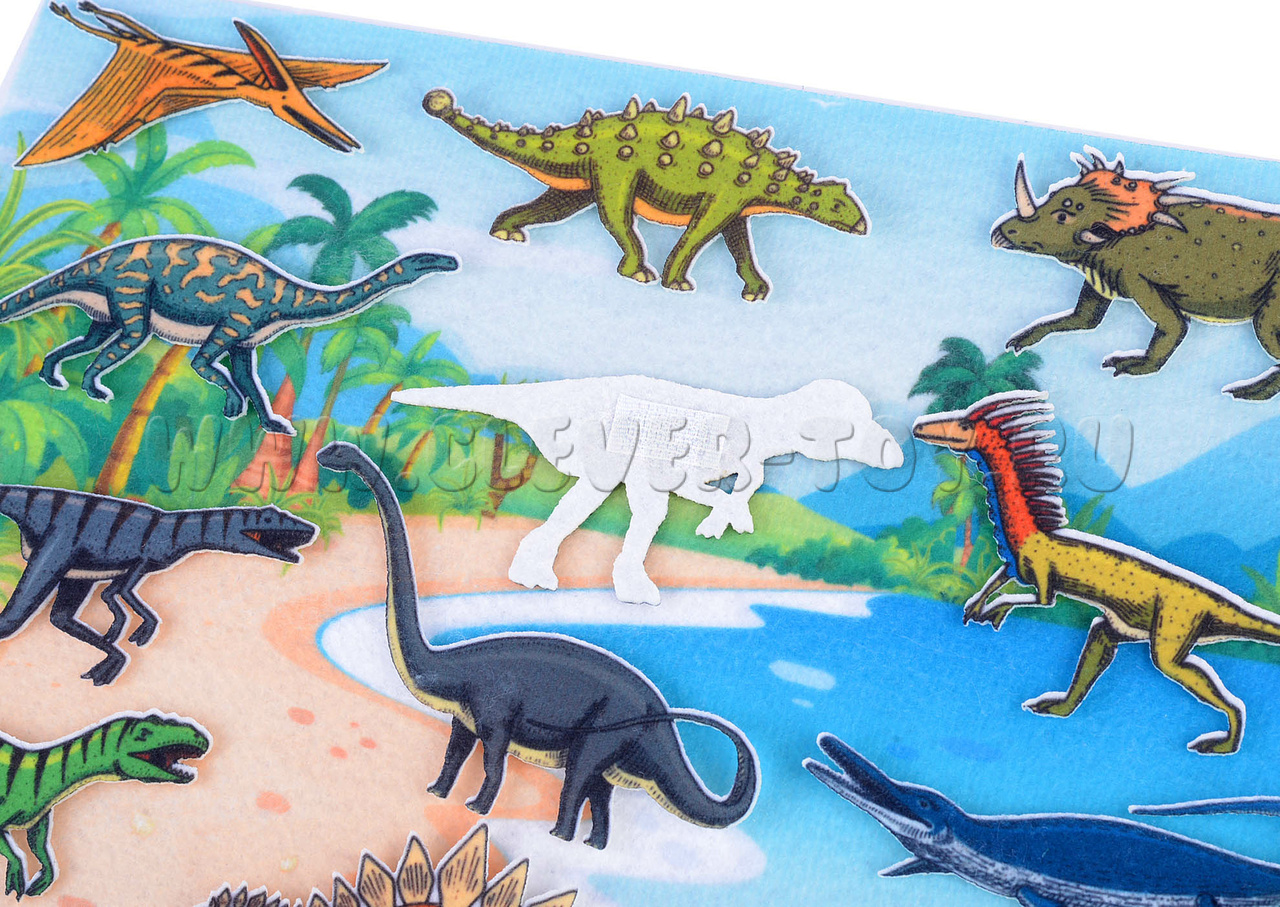 • 12 фетровых фигурок динозавров – мезозавр, птерозавр, велоцираптор, стегозавр, барозавр, анкилозавр, эласмозавр, тираннозавр, платеозавр, трицератопс, дейноних, пахицефалозавр.