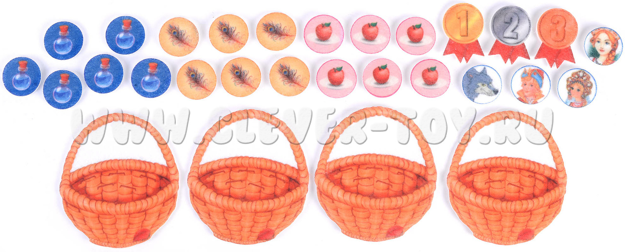 • 1. ФИГУРКИ С ВОЛШЕБНЫМИ ПРЕДМЕТАМИ (волшебное яблочко на тарелочке, живая вода, перо Жар-птицы) занимают соответствующие изображениям поля на карте.