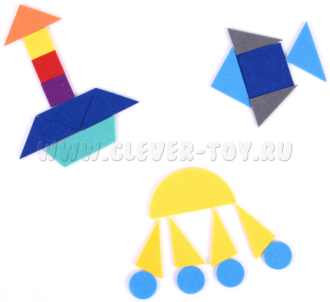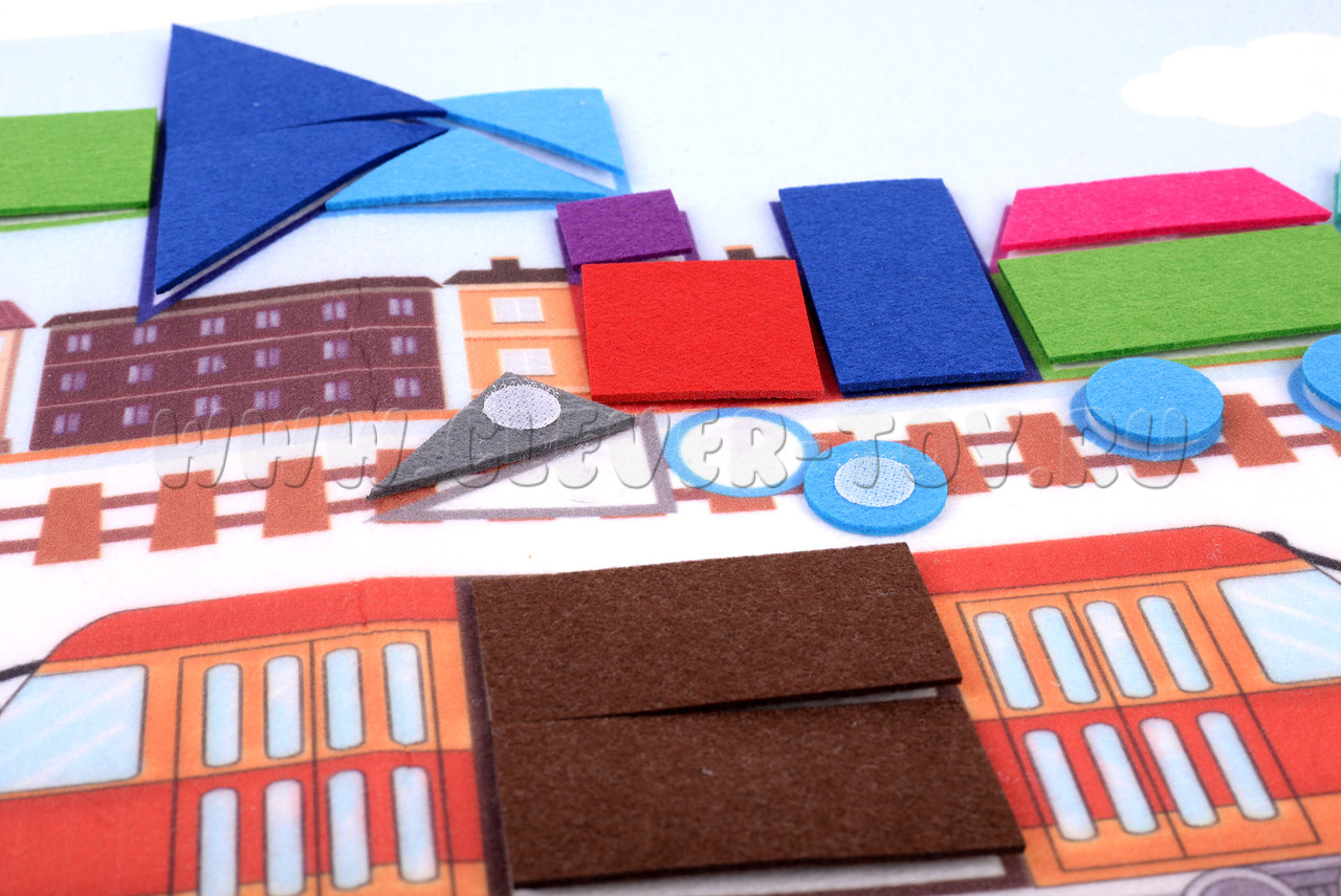 Состав набора: основа из фетра 1шт., геометрические фигуры на липучках 61 шт.