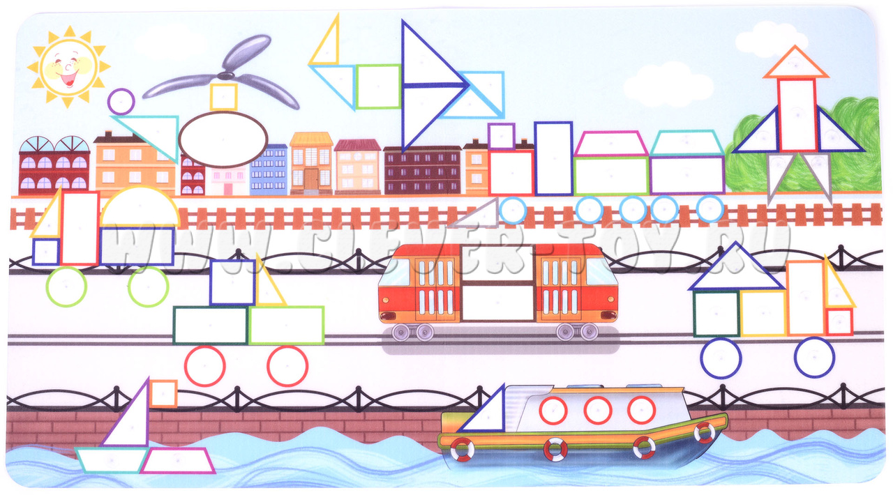 1. Рассмотрите большой город вместе с ребенком. Предложите "раскрасить" городской транспорт, подбирая соответствующие фигурки по цвету и форме. Назовите, какого цвета, какой формы колеса у грузовика, иллюминаторы у парохода, хвост у самолета и т.д. Сортируйте геометрические фигуры по цвету, форме, размеру.