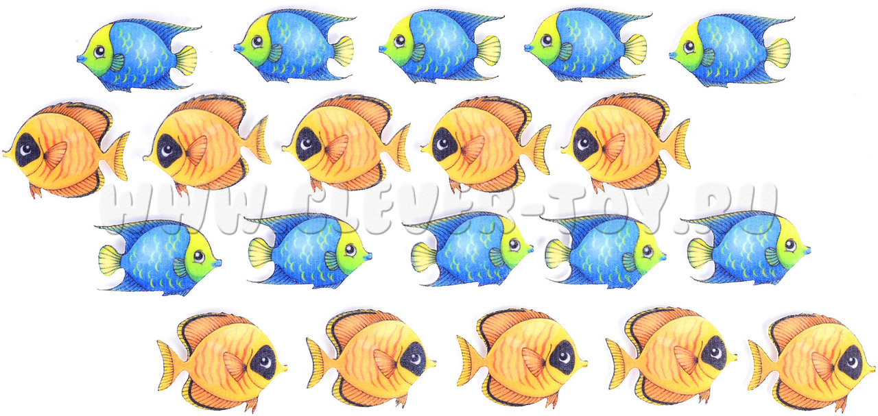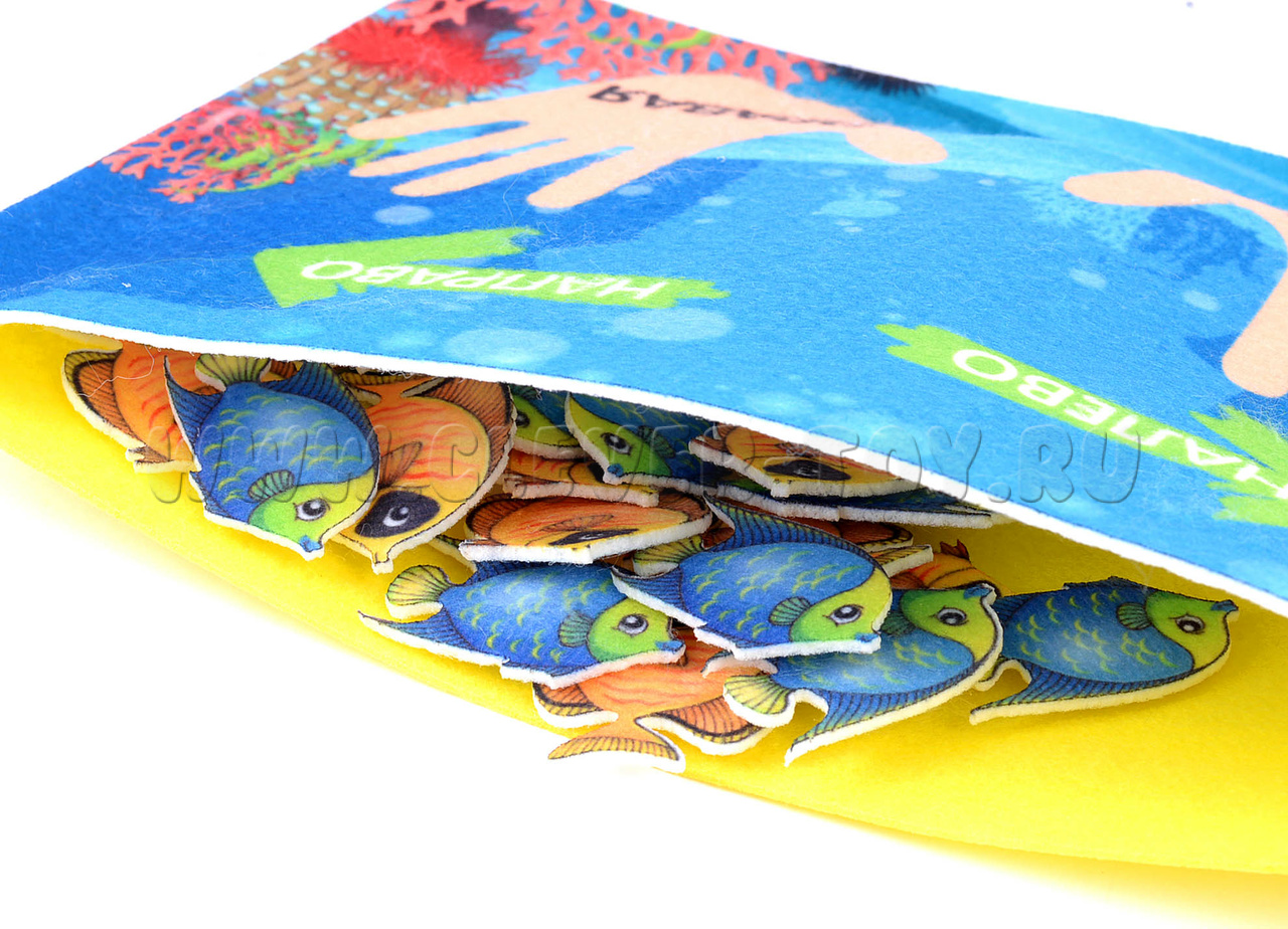 В наборе яркое игровое поле и 20 рыбок двух цветов.