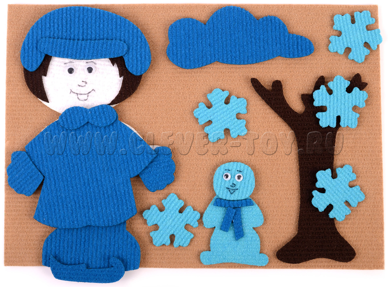 - одежда, аксессуары и атрибуты зимы (синий): шапка, шуба, сапоги, перчатки, снежинки, снеговик, туча;
