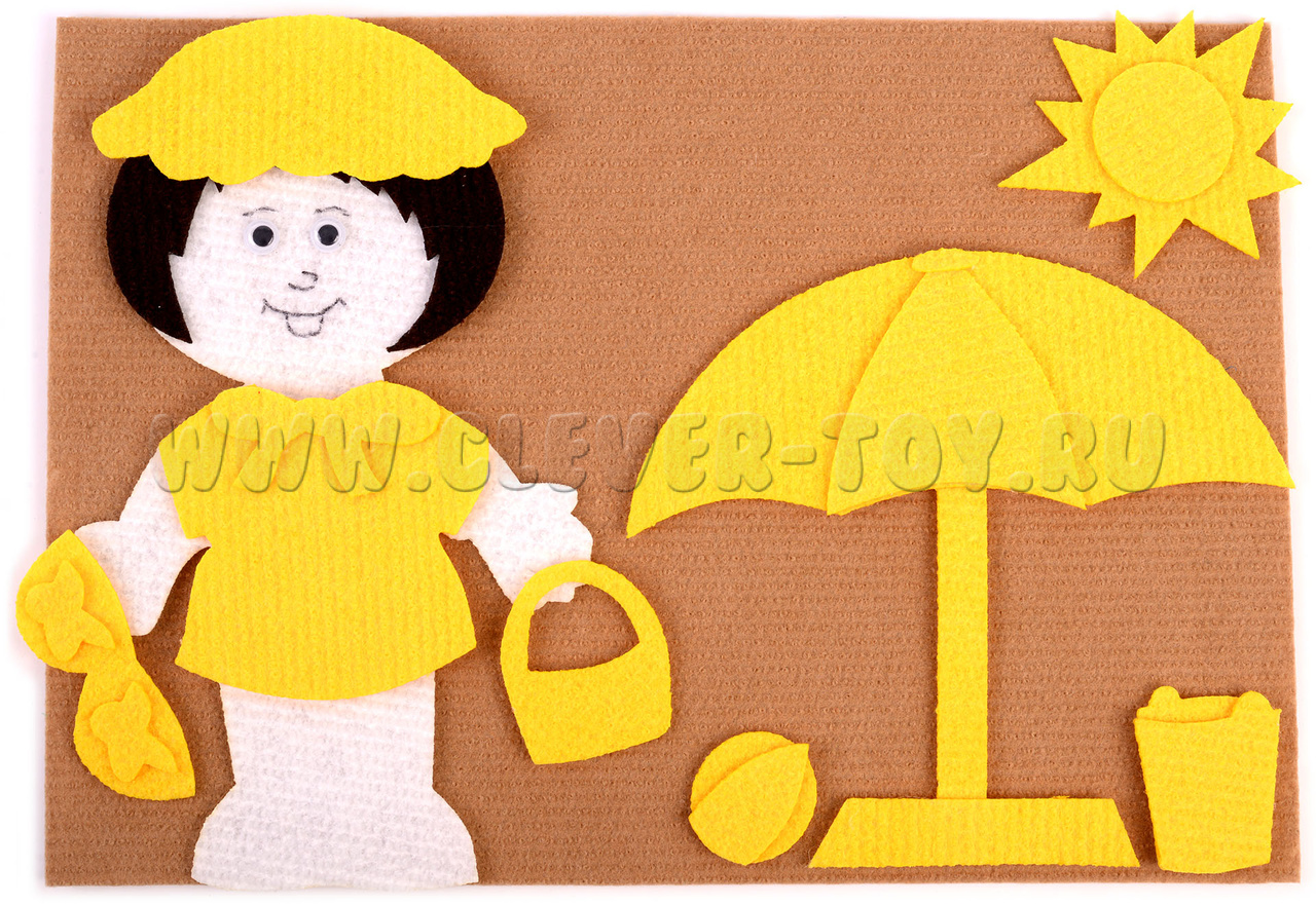 - одежда, аксессуары и атрибуты лета (жёлтый): платье, панамка, босоножки, зонт, корзинка, ведёрко, мяч, солнце;