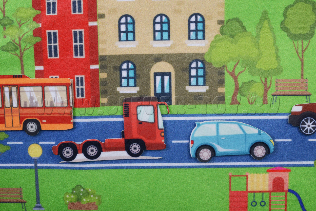 - игровое поле большого размера, выполненное в виде коврика с нарисованным на нём городом с дорогами, мостами, деревьями, зданиями;