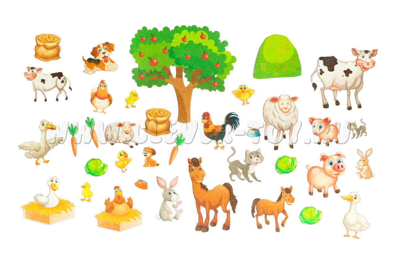 - игровые элементы и фигурки животных – коровы, поросята, курицы, петух, собаки, кошки, зайчики, лошади, овцы, гуси, цыплята, сено, мешки с зерном, морковка, капуста, яблоня.