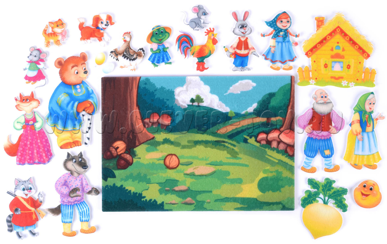 В комплект входят игровые элементы для пяти известных сказок: «Колобок», «Теремок», «Курочка Ряба», «Репка» и «Маша и медведь». Фигурки можно передвигать по полю или прикреплять с помощью липучек.