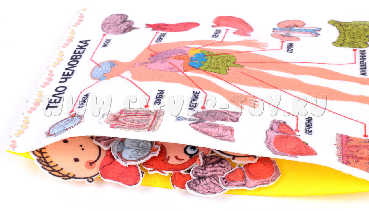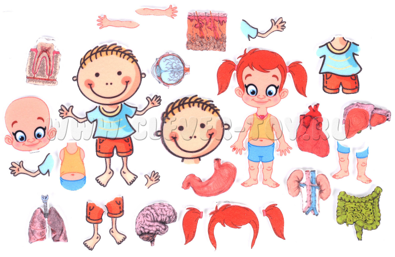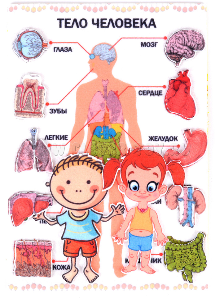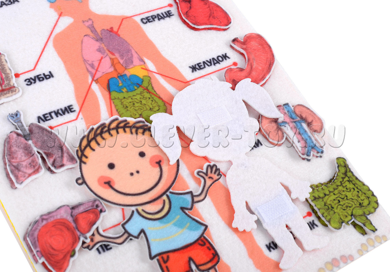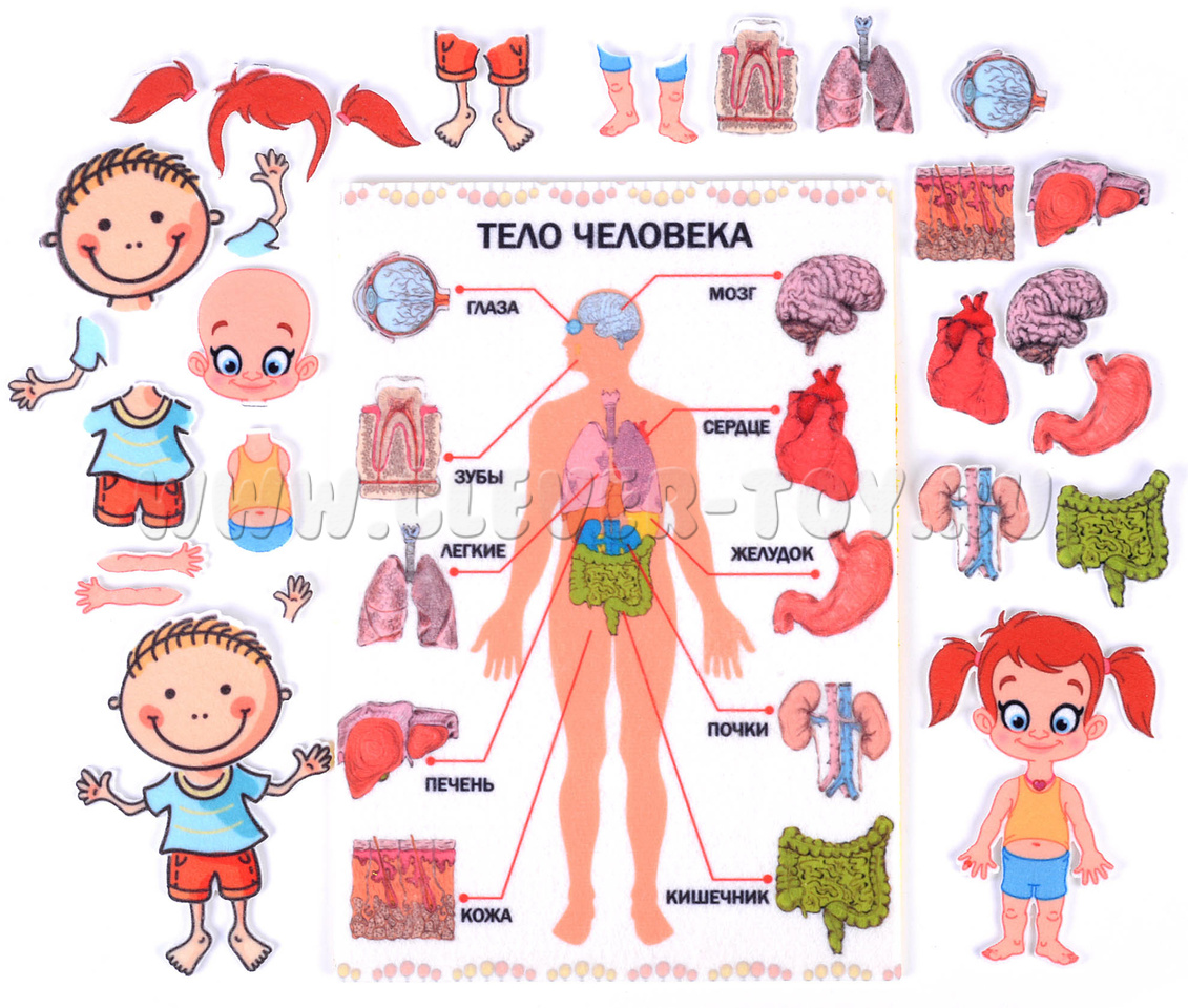 - игровое поле-плакат, где изображен человек и части его тела с подписями, на этом поле располагаются элементы – органы – на многоразовых липучках.
