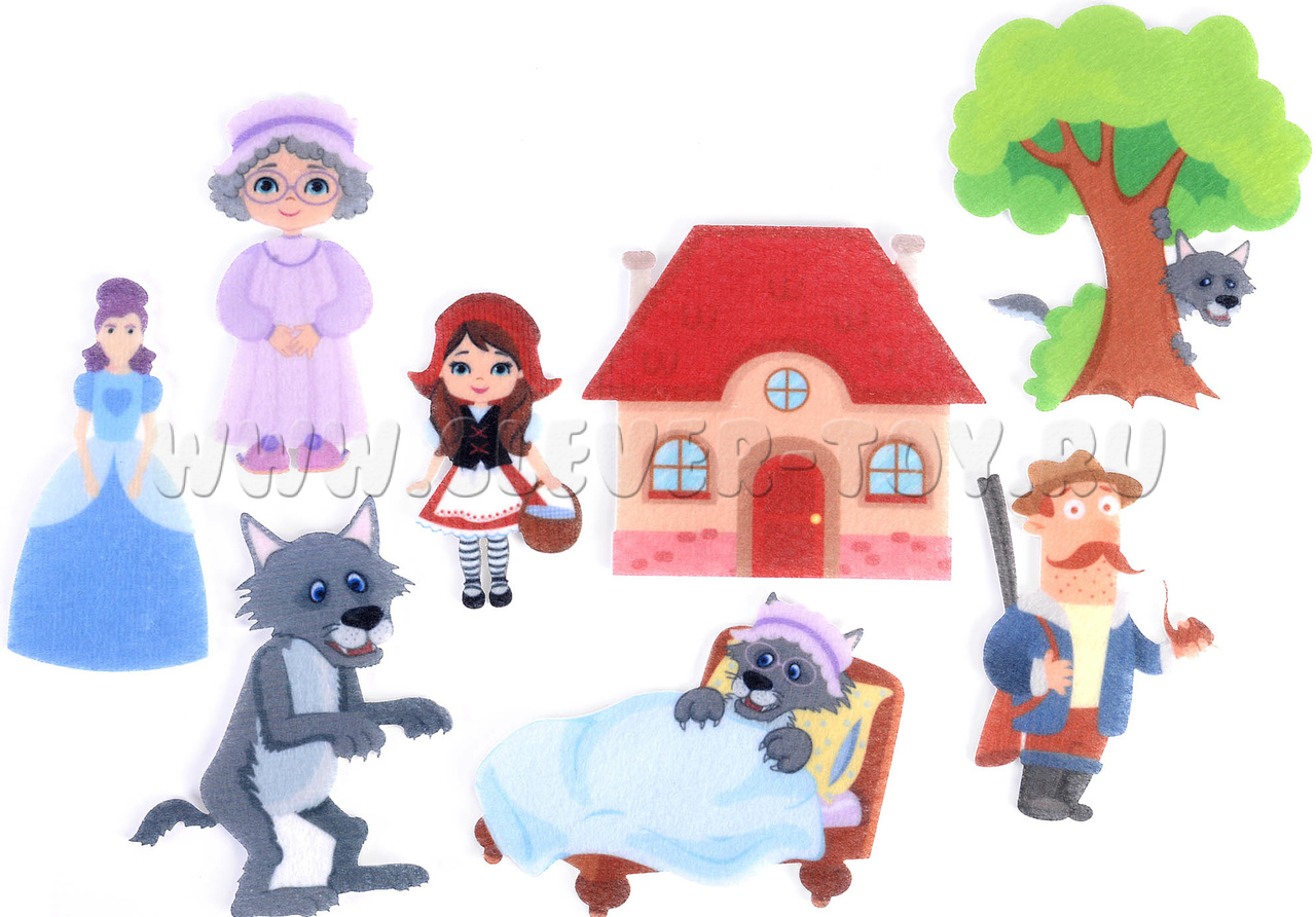 - Фигурки персонажей: Красной Шапочки, бабушки, волка в двух образах, мамы и охотника (6 шт.).