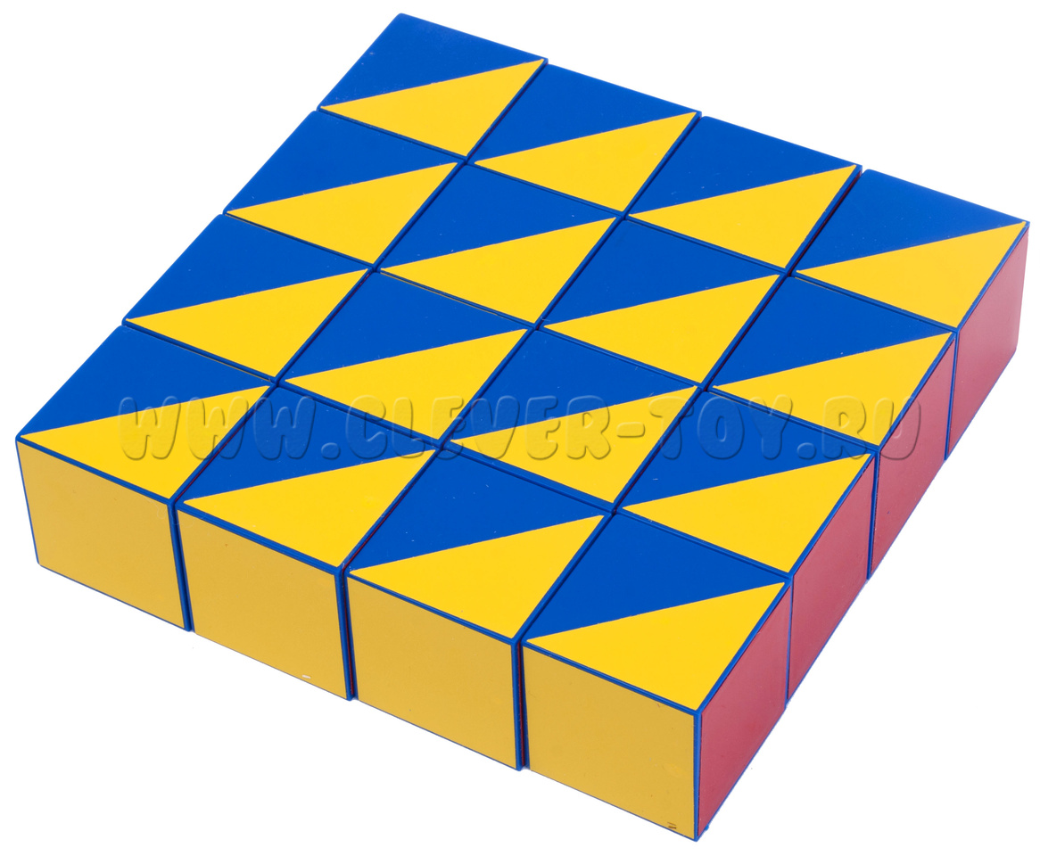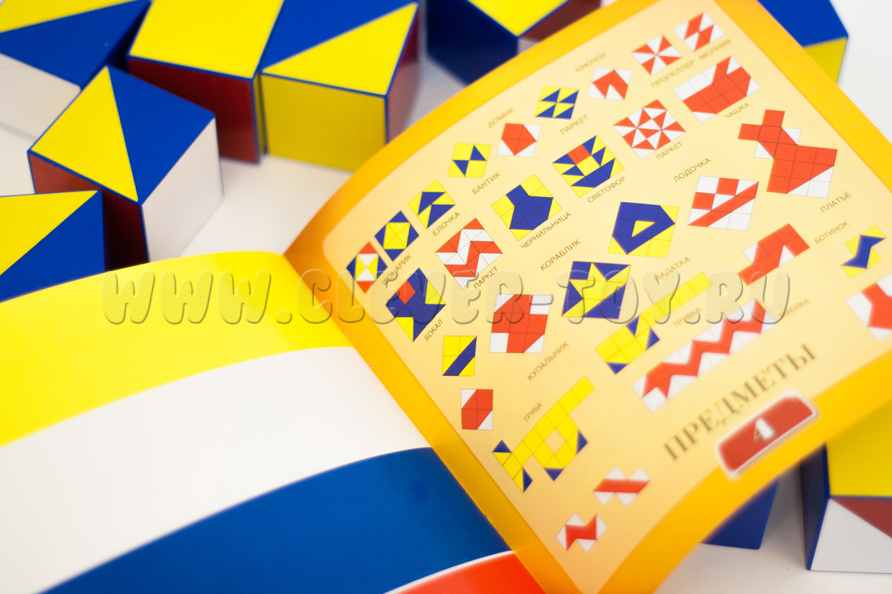 Развивающая игра состоит из 16 кубиков, грани которых окрашены в четыре цвета (красный, желтый, синий, белый) определенным образом. Каждой грани соответствует свой узор.