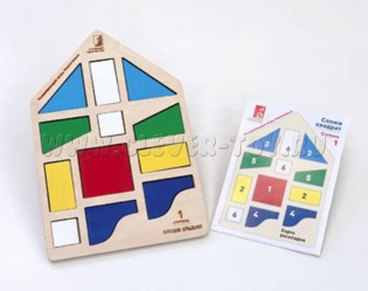 Деревянный планшет - "домик" - это методически правильная упаковка, где фрагменты квадратов хранятся в разобранном виде, что позволяет детям проявлять самостоятельность и творческое мышление.