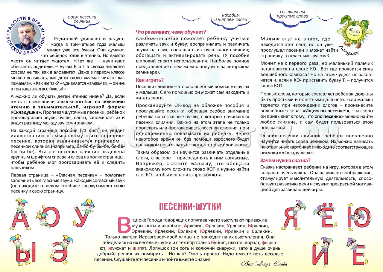При обучении необходимо добиться того, чтобы ребёнок хорошо знал песенки слияния. С их помощью он сможет сам находить и читать слоги.