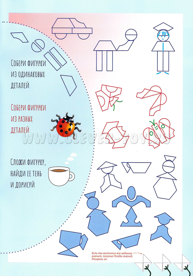 - Изображения в альбоме отличаются по размеру и уровням сложности: на белой части листа – схематические изображения реального размера (соответствуют размерам деталей конструктора – 1 уровень сложности), сбоку расположены уменьшенные схемы, собирать по которым сложнее, и составлять фигурку можно не на самой схеме, но рядом с ней (2 уровень сложности).