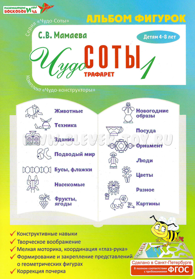 В альбоме 20 страниц со схемами конструирования для игры "Чудо-Соты 1". Ребенок конструирует фигуры по схемам, на разные темы («Животные», «Техника», «Подводный мир» и др.), а потом создает свои собственные образы. Выбирайте то, что интересно сегодня, или учитесь по порядку.