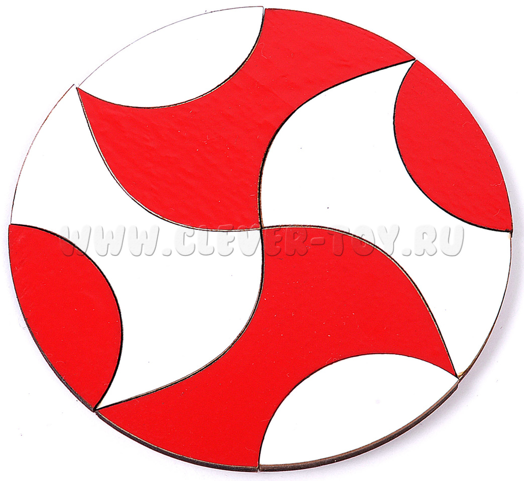 Форма головоломки – круг – олицетворение мироздания, универсальной модели вселенной. Цвета: красный – активизирует работу мозга, вызывает первоначальный интерес ребёнка к составлению фигур из деталей головоломки; и белый – даёт ощущение совершенства, завершённости, символизирует свободу и снятие препятствий.