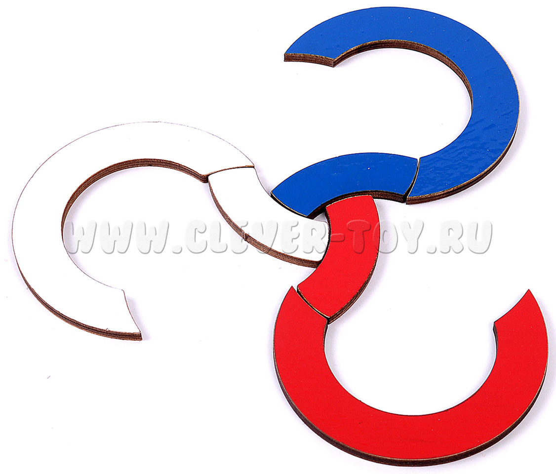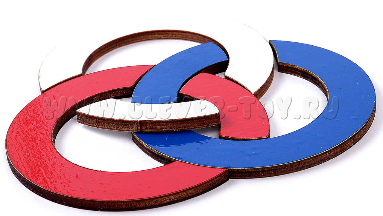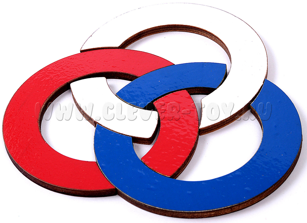 - деревянные элементы головоломки – 6 частей колец. Каждое кольцо одного цвета (белый, синий, красный) состоит из 2-х частей (большой и маленькой);