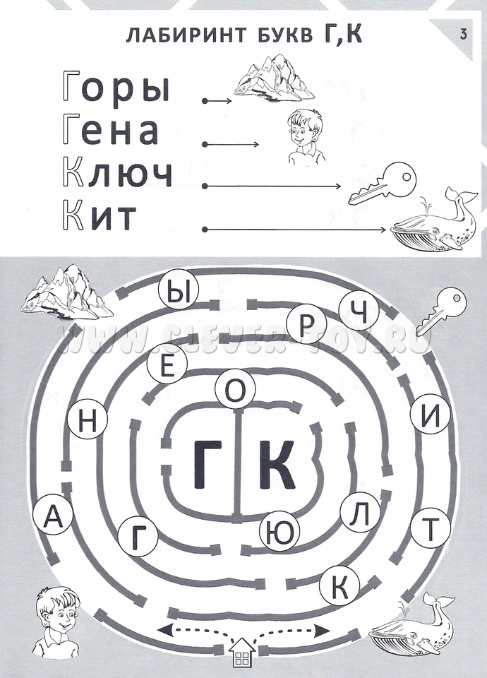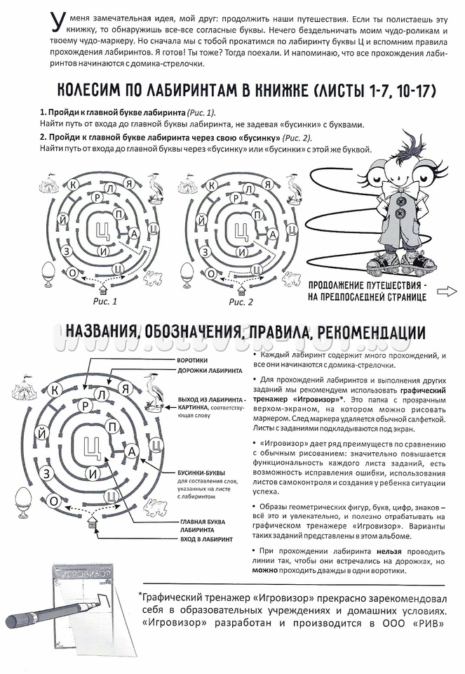 В Лабиринтах помещены главные согласные буквы (в центре), с которых начинаются слова и буквы (гласные и согласные), из которых эти слова состоят. Следуя по Лабиринтам, ребёнок учится узнавать буквы и составлять слова.