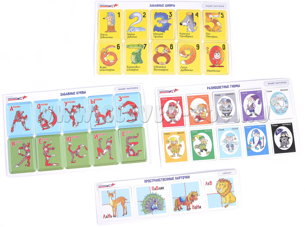 - забавные цифры – 10 карточек – Ёжик Единичка, Зайка Двойка, Мышка Тройка, Крыска Четвёрка, Пес Пятёрка, Кот Шестёрка, Крокодил Семёрка, Обезьяна Восьмёрка, Лиса Девятка, Магнолик Нолик;