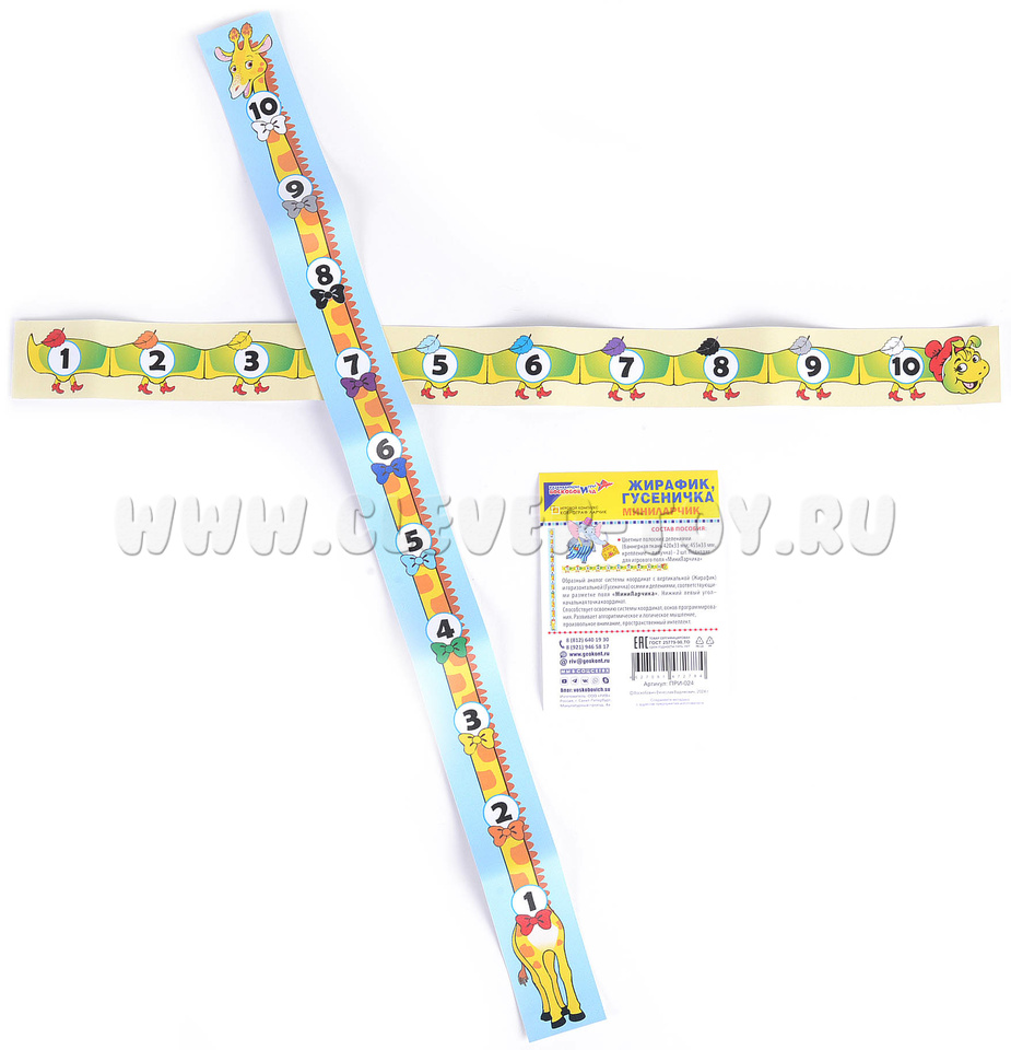 Две цветные полоски с делениями (баннерная ткань 42 х 3,3 см и 45 х 3,3 см, крепление – липучка) с делениями, соответствующими «МиниЛарчику» и числовым рядом от 1 до 10.