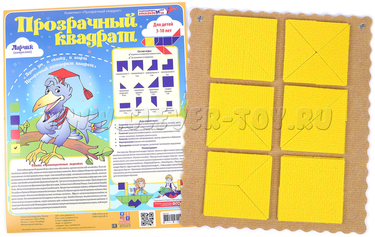 Конструктор «Прозрачный квадрат Ларчик» - эффективное средство накопления детьми логико-математического опыта, дающего возможность познавать мир самостоятельно. Игровое пособие можно использовать как самостоятельно, так и с развивающими играми и пособиями: «Коврограф Ларчик», «МиниЛарчик», «Прозрачный квадрат Ларчик (других цветов)», «Прозрачный квадрат», «Набор цифр и знаков Ларчик», «Треузорчик Ларчик».