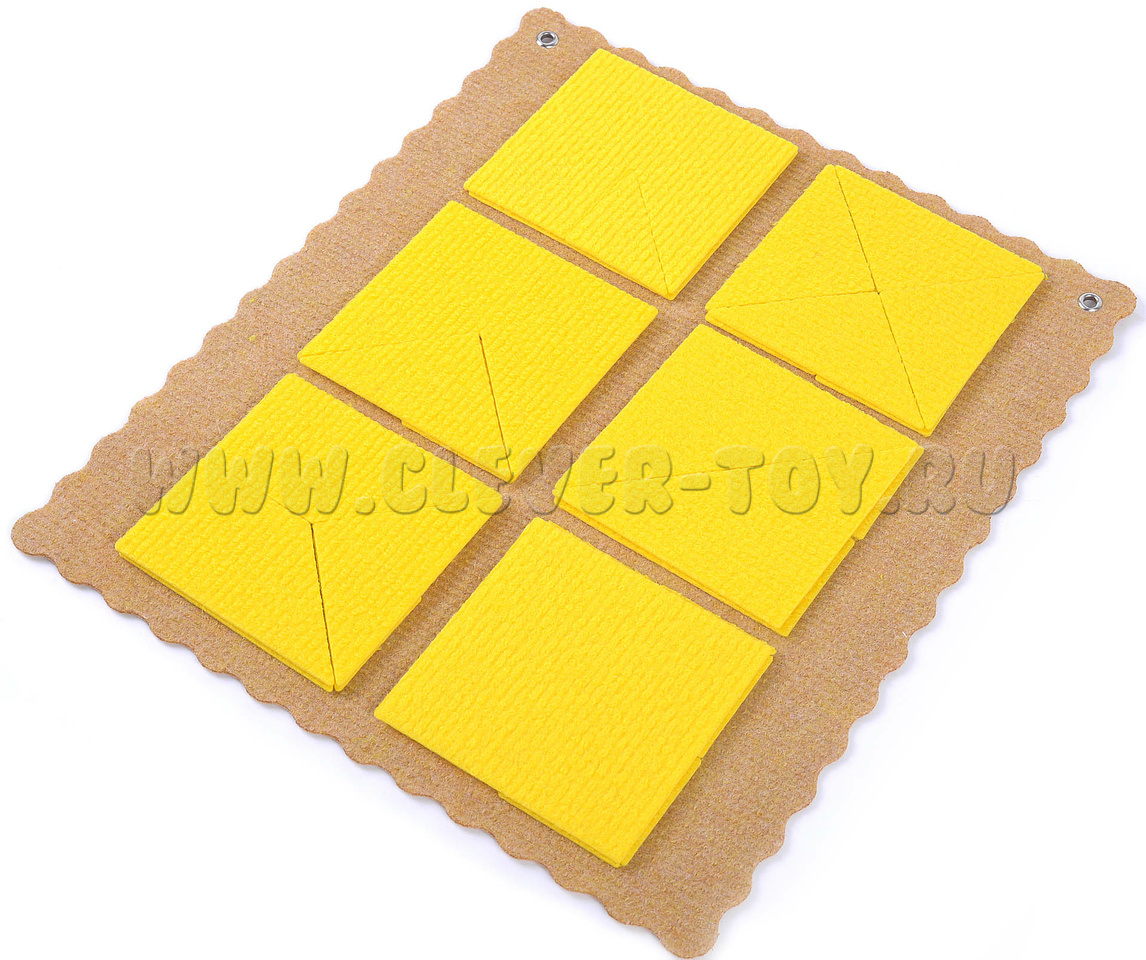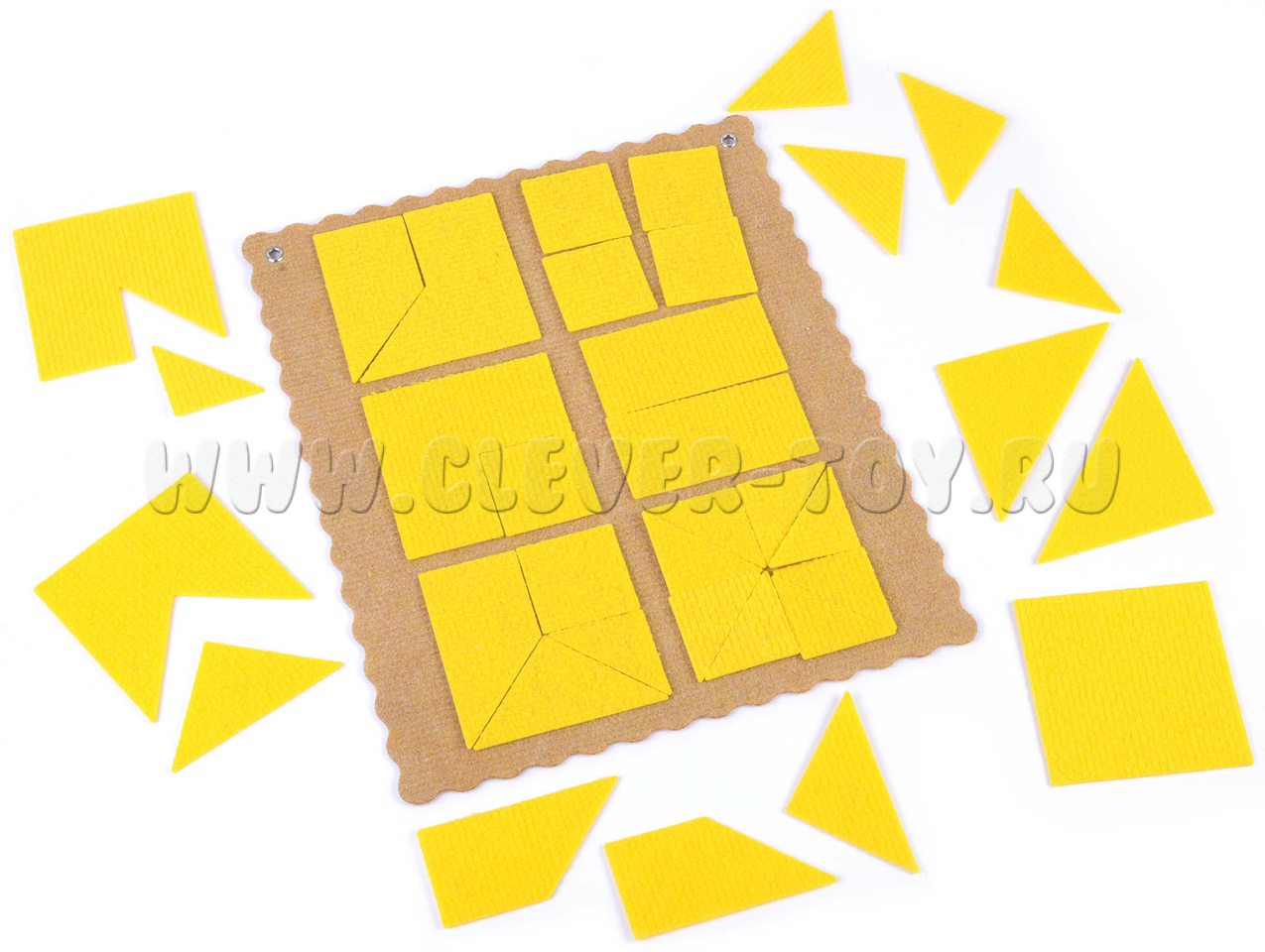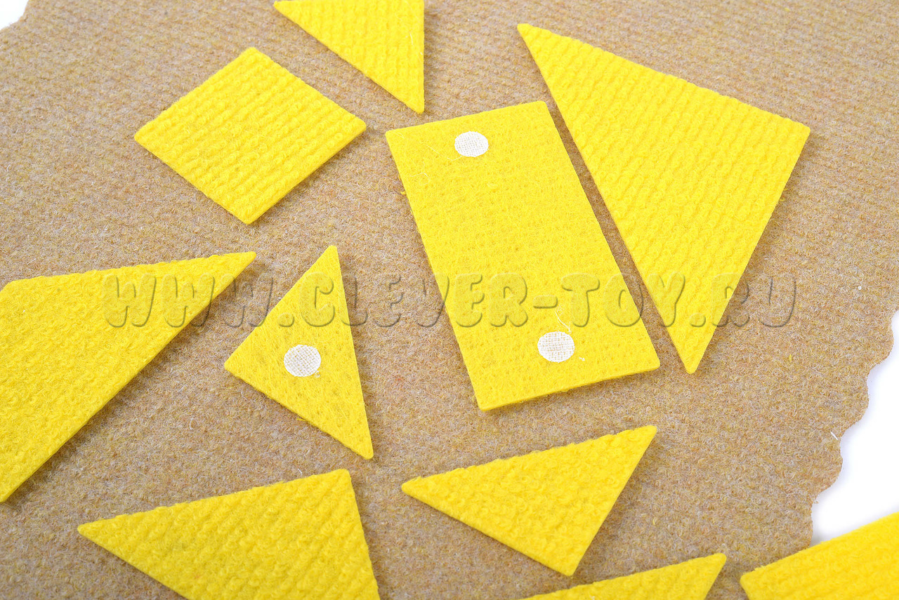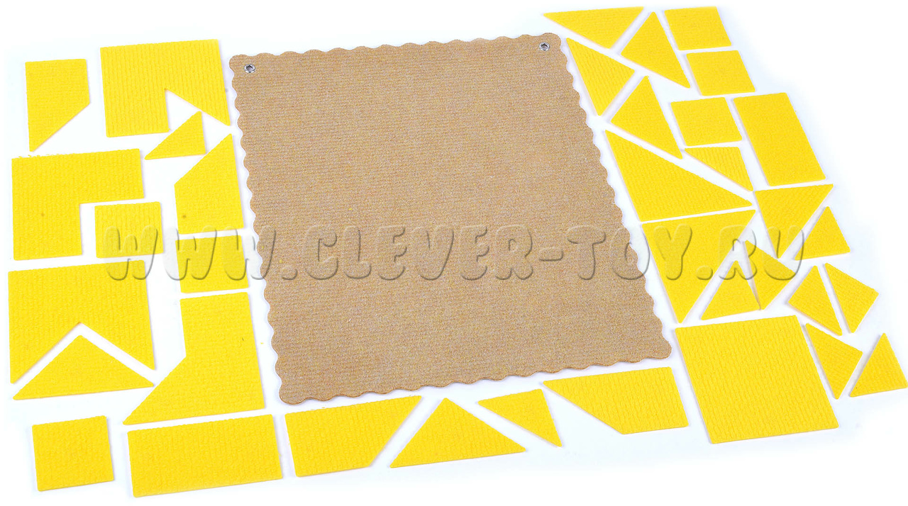 - 36 элементов из ковролина (многоугольник 1 – 1 шт., многоугольник 2 – 1 шт., многоугольник 3 – 1 шт., многоугольник 4 – 1 шт., треугольник маленький – 10 шт., треугольник средний – 7 шт., треугольник большой – 2 шт., квадрат большой – 1 шт., прямоугольник – 2 шт., трапеция 1 - 3 шт., трапеция 2 – 1 шт., квадрат маленький – 6 шт.;