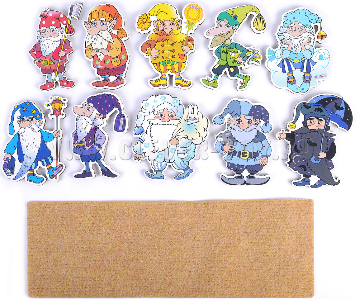 1. Гномы (10 шт), контурные фигуры (фанера, цв. плёнка); Крепление: липучка (контактная лета), магнит;