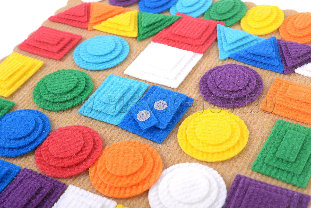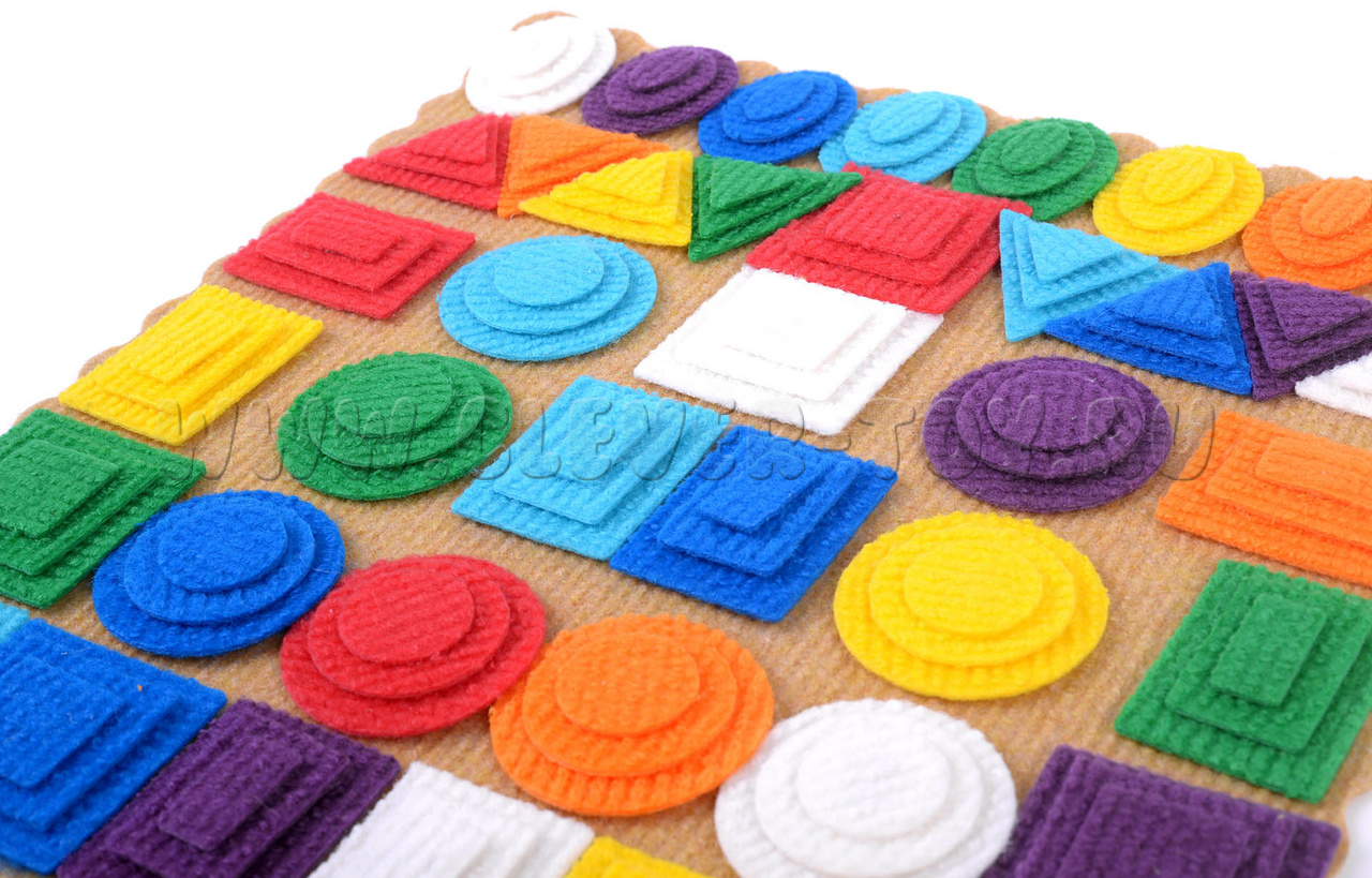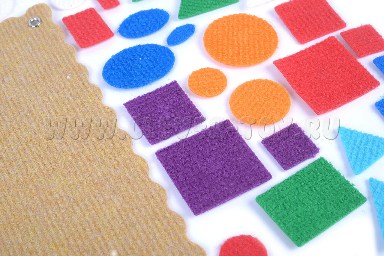 - Фигуры из ковролина 3-х размеров,8-ми цветов (красный, жёлтый, зелёный, синий, оранжевый, голубой, фиолетовый, белый):