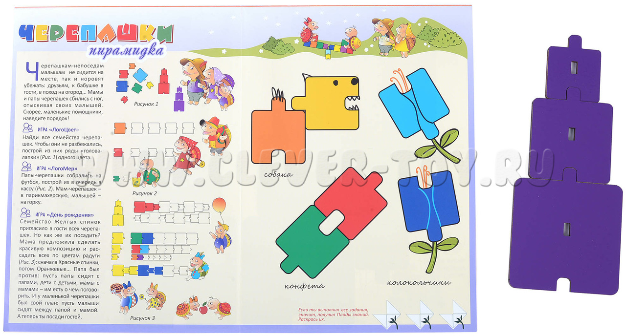 - Дети от 2 до 4 лет играют с фигурками всех цветов, выполняют задания со звёздочкой, складывают из деталей «Черепашки» различные образные фигурки по замыслу или по схемам в альбоме.