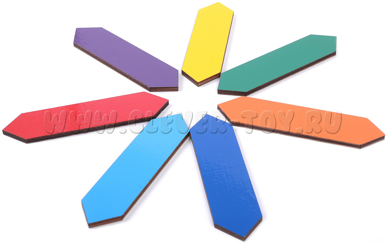 - двусторонние палочки для складывания цифр, выполнены из дерева, окрашены яркой и безопасной краской; с одной стороны они окрашены в цвета радуги, с другой – в любой другой цвет;