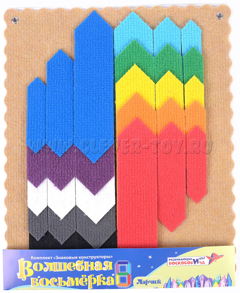 Игра «Волшебная Восьмёрка Ларчик» для детей от 3 до 9 лет может использоваться совместно с развивающими играми «Волшебная Восьмёрка (1,2,3)», «Волшебная Восьмёрка Магнит». В отличие от перечисленных игр, «Волшебная Восьмёрка Ларчик» имеет свойство наложения палочек друг на друга, что позволяет разнообразить задания с дорожками и схемы для конструирования.