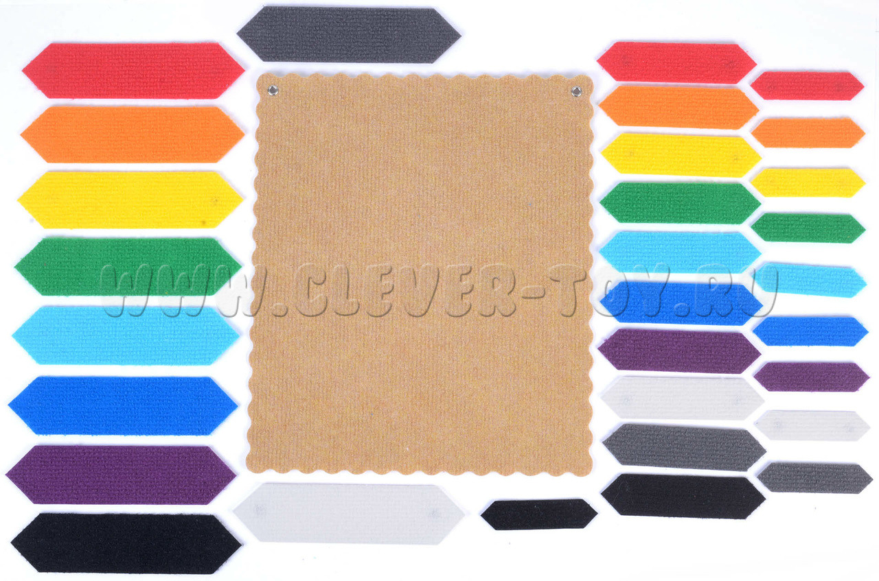 - три набора по 10 разноцветных односторонних палочек (радужные цвета + белый, серый, чёрный), палочки отличаются по величине (маленькие – 10 см., средние 14 см., большие 20 см.);