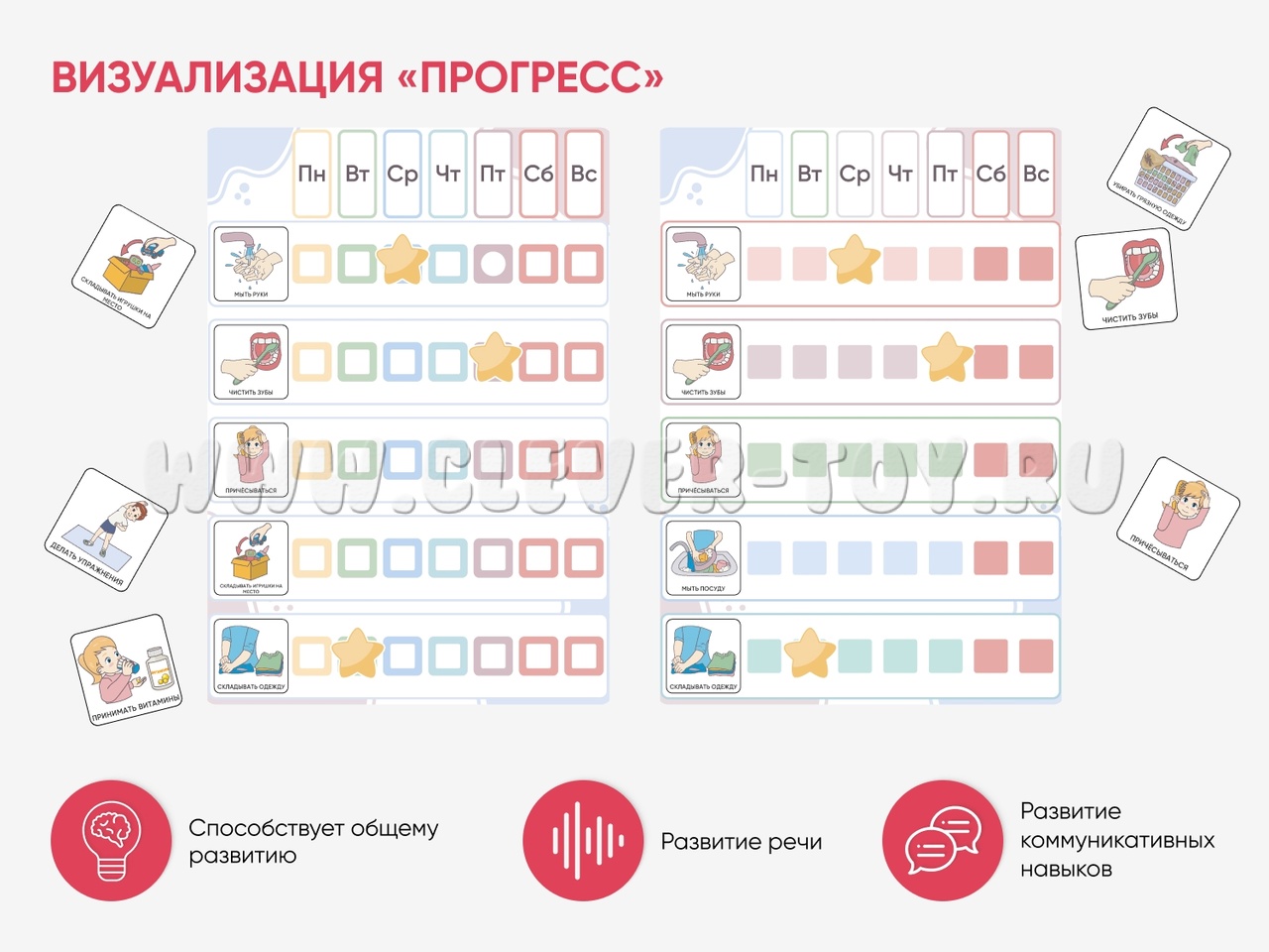 Пособие для организации обучения ребенка ежедневным рутинам: чистить зубы, собирать игрушки, собирать портфель и другие. Помогает фиксировать успешность формирования новой привычки и поддерживает мотивацию ребенка. Карточки для мальчика и для девочки.
