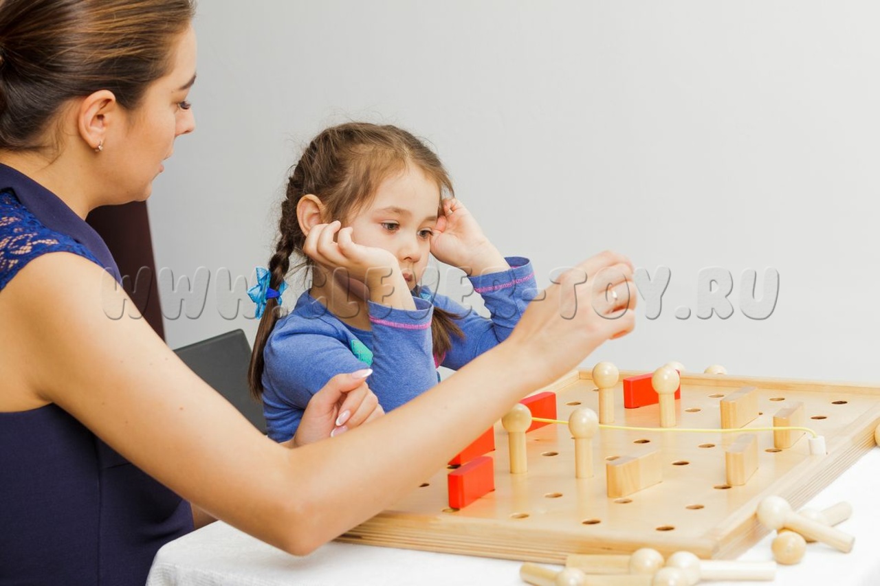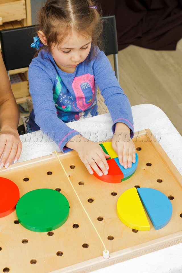 Более 125 деталей + игровая доска с отверстиями. Крепления, верёвочки, целые и сегментированные геометрические фигуры. Ребёнок осваивает понятия «часть/целое», ориентировку в пространстве (ближе/дальше, вправо/влево), конструирование.