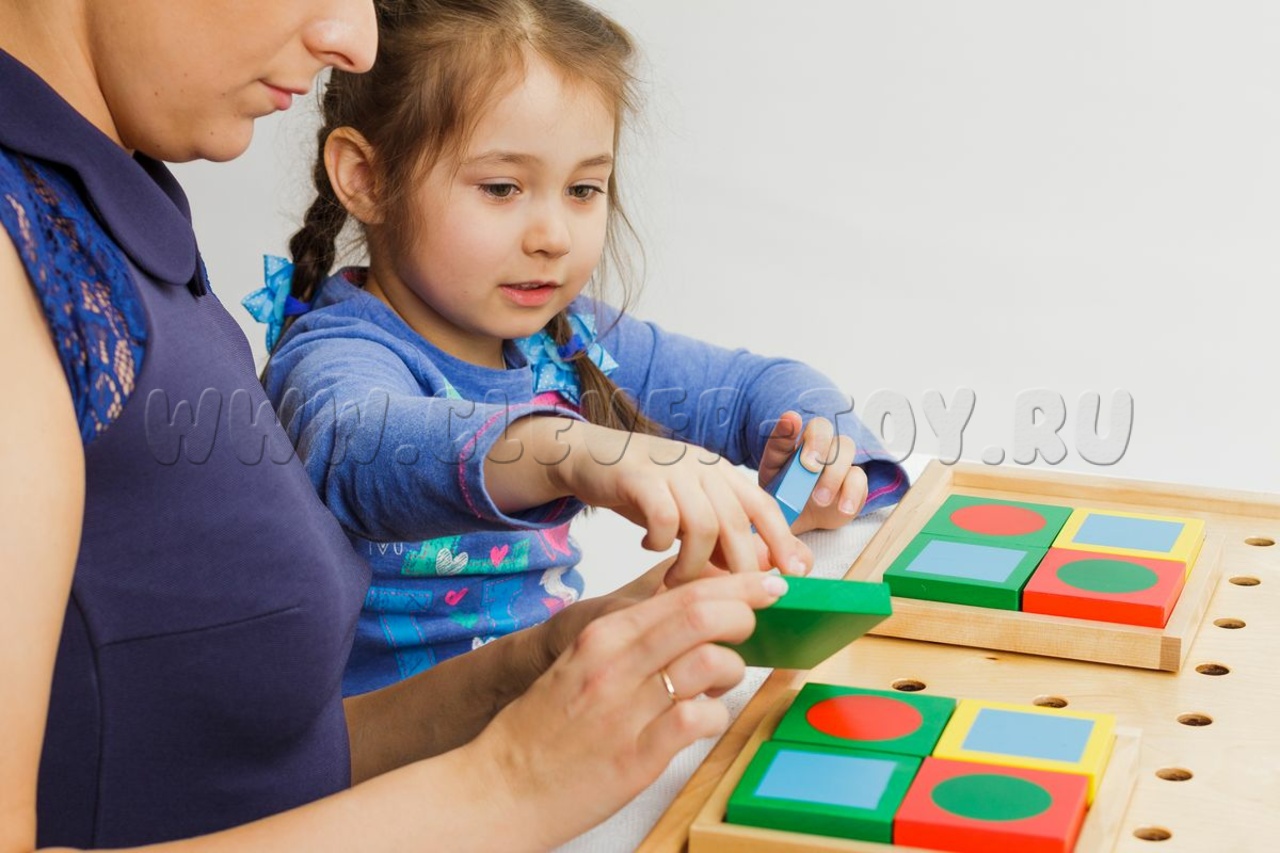 Более 100 фигур (квадраты, прямоугольники, треугольники) 4 цветов + доска-основа с бортиками. Ребёнок учится сравнивать, находить общее/различное, собирать изображения, осваивает геометрию и счёт.