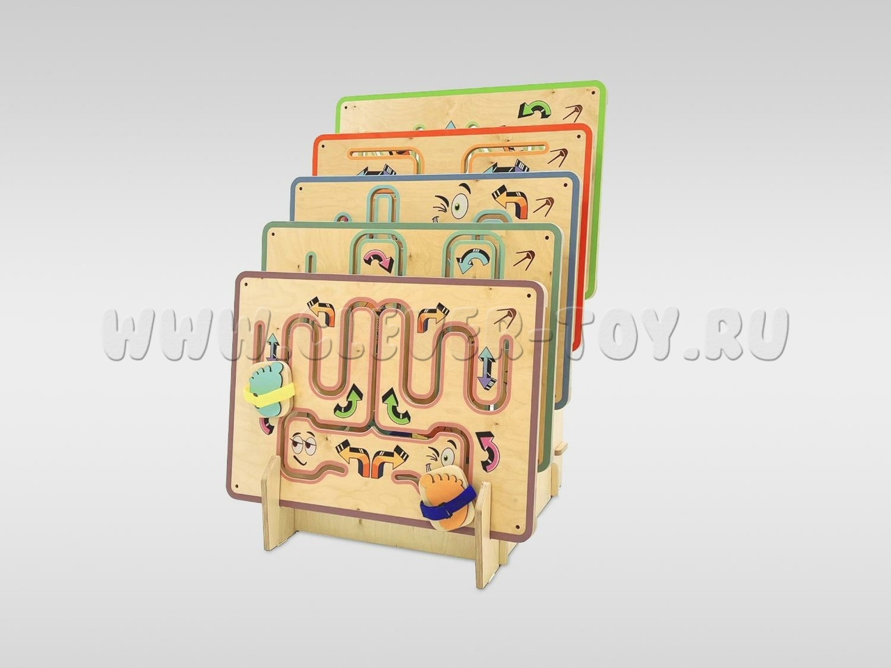 Платформы крепятся к стене, дети садятся на пол, вставляют ноги в специальные крепления на подвижных элементах и перемещают их по лабиринту. В наборе присутствуют пять платформ и подставка для них. Можно разместить все сразу или только одну платформу, меняя их при необходимости. Методическое пособие предлагает различные варианты занятий для детей.
