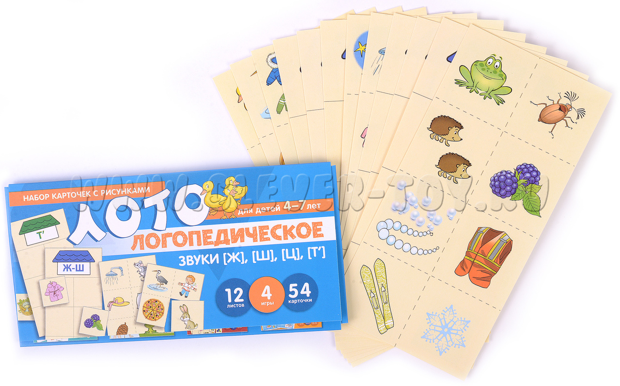 Комплект "Логопедическое лото. Учим звуки [Ж] [Ш] [Ц] [Т’]" представляет собой набор логопедических карточек, разработанных специально для дошкольников и младших школьников. Этот учебно-игровой комплекс состоит из 12 листов, на которых размещены 54 карточки и 6 заданий.