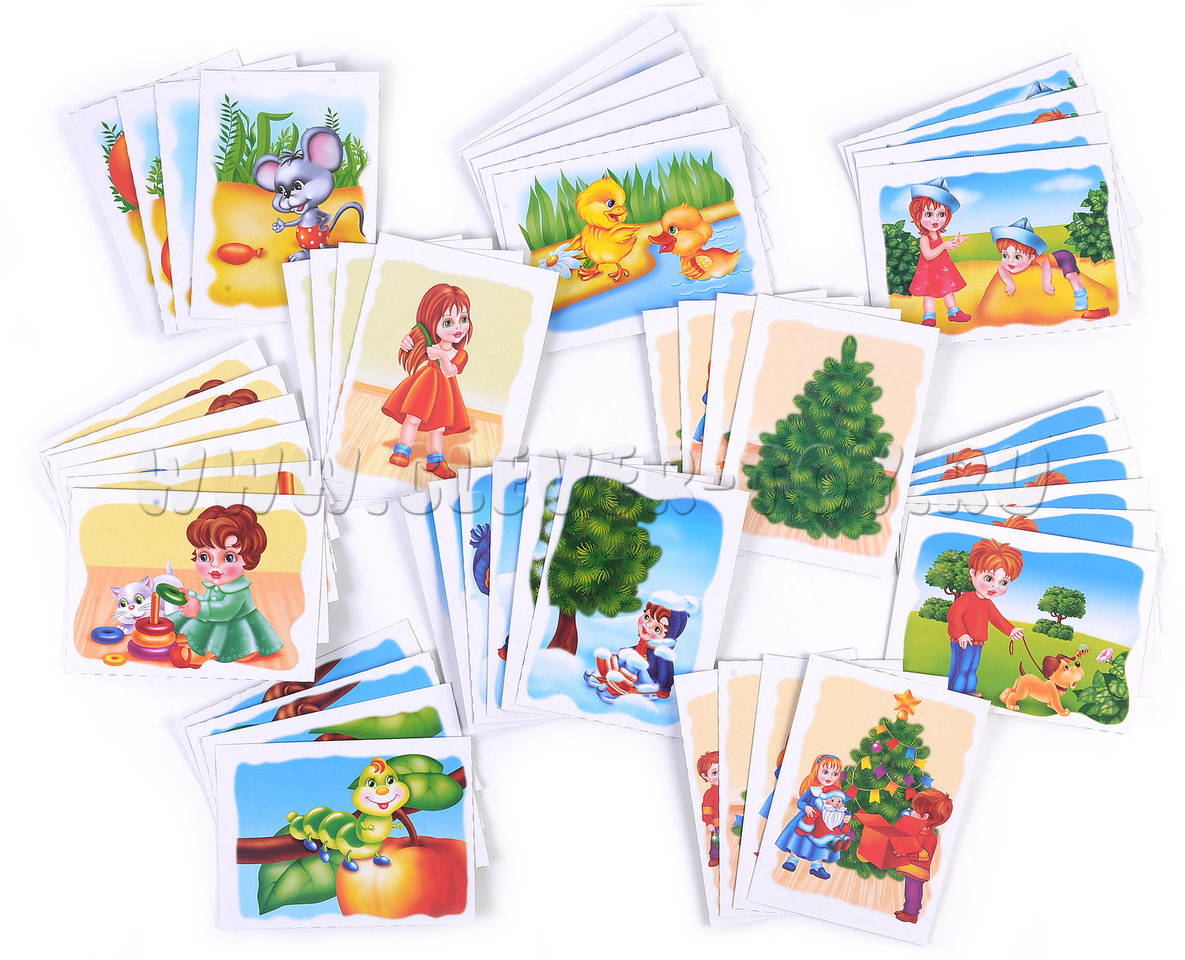 - сочинение историй с участниками картинок, во время которого малыш узнает и запоминает новые категории (названия домашних животных, времен года, мест и т.д.) и признаки, им характерные, расширяет представления об окружающем мире и учится использовать имеющиеся и новые знания в процессе мышления;