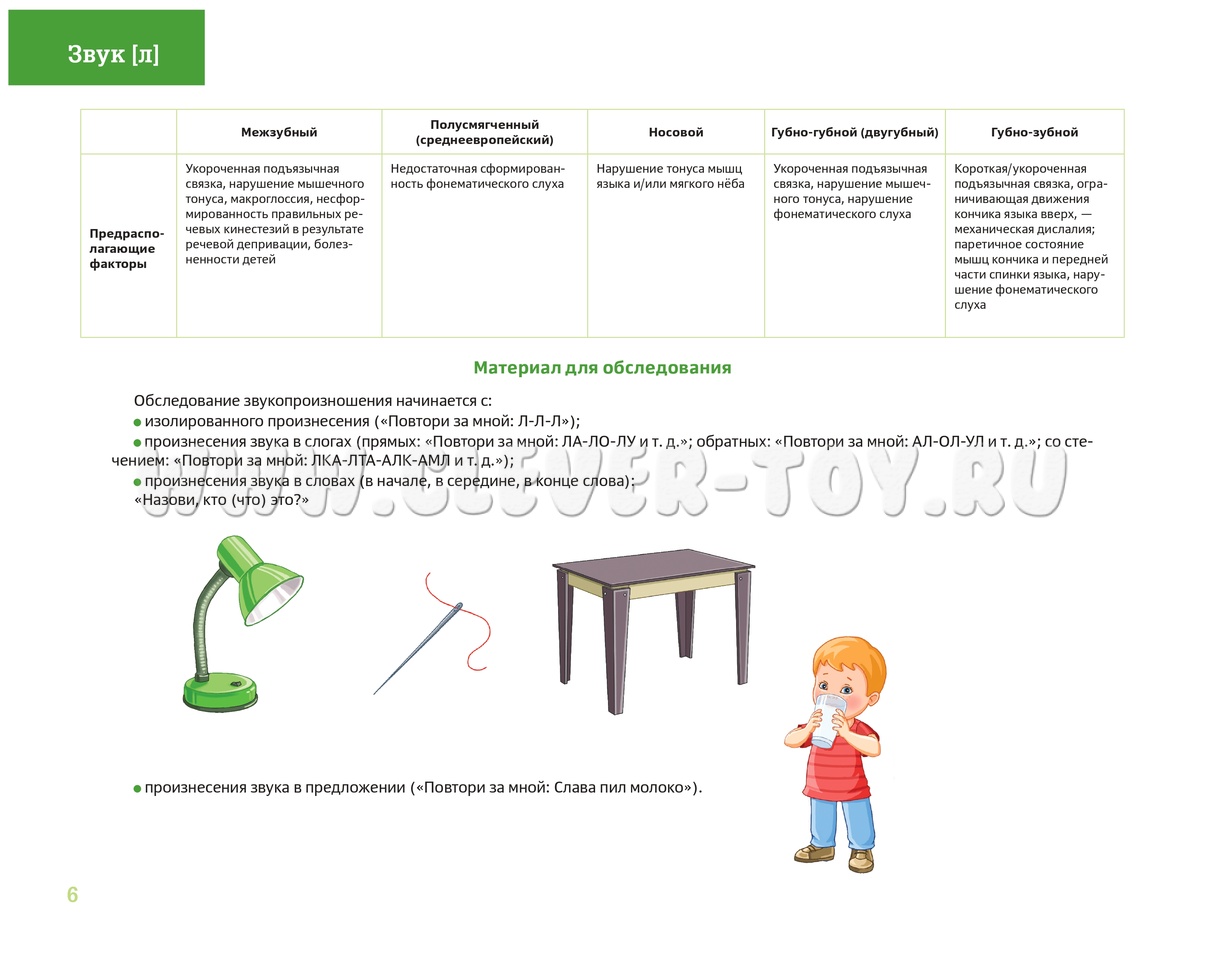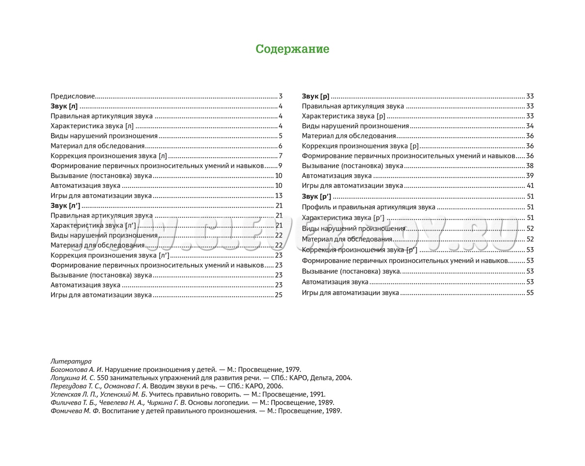 Здесь же приводится речевой и наглядный материал для проведения обследования состояния звукопроизношения сонорных звуков, поэтапная коррекция нарушений произношения данной группы звуков.