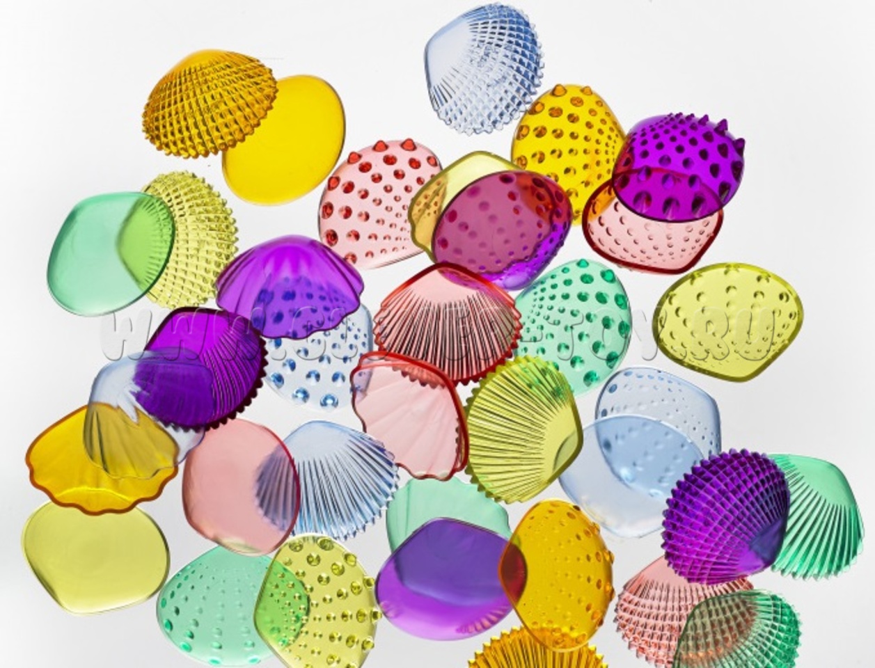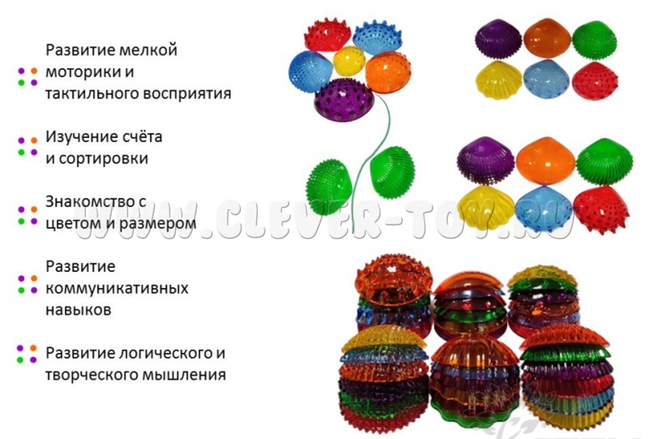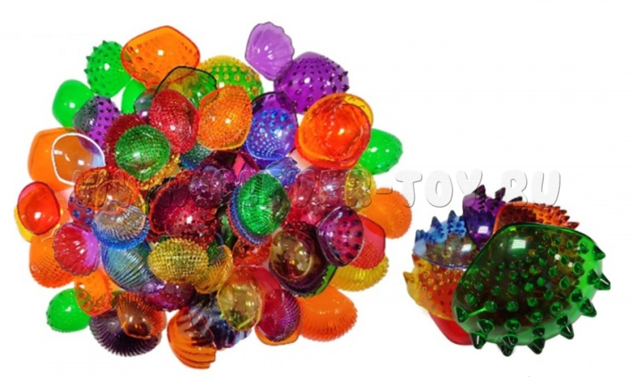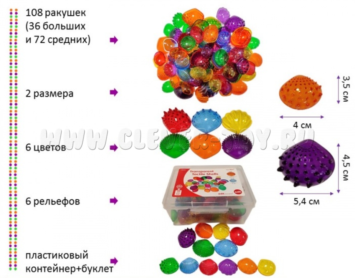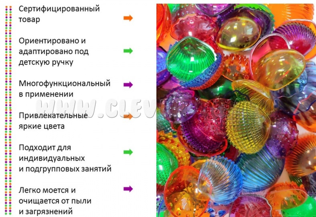 2 размера ракушек (5,4 см и 4 см), в 6-ти цветах, 6 различных тактильных поверхностей.
