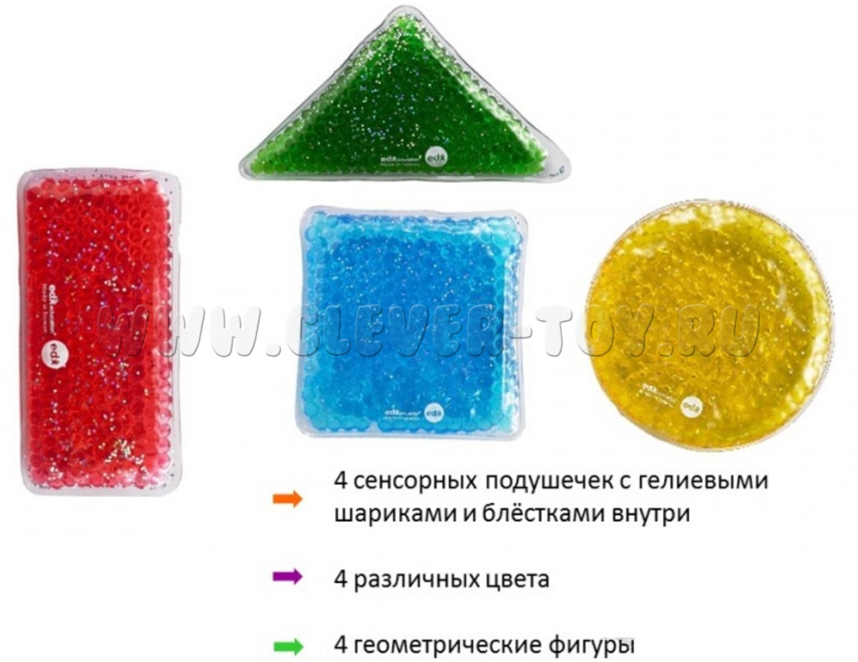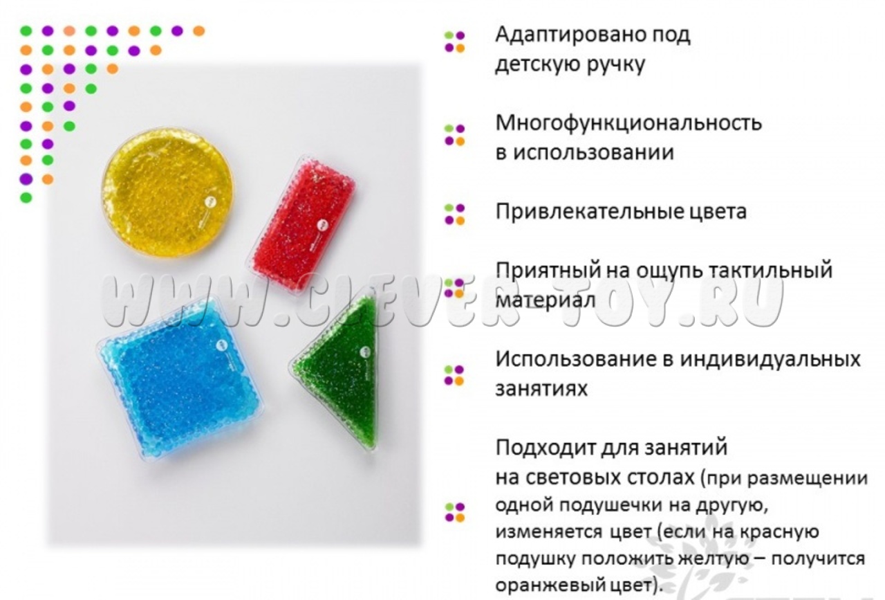 Набор подойдет для использования на световых столах: при размещении одной подушечки на другую, изменяется цвет (например: на красную подушку положить желтую - получится оранжевый цвет).