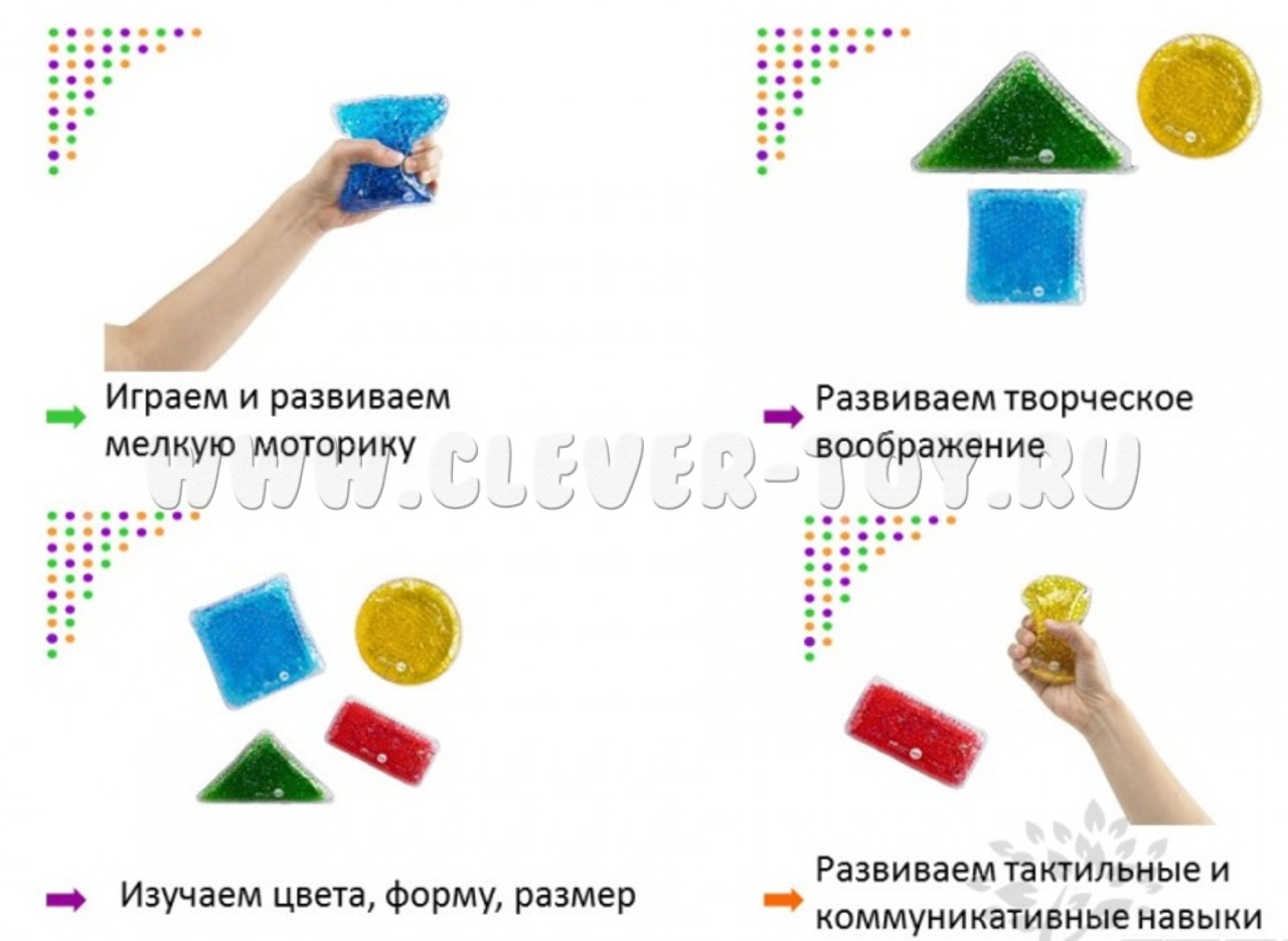 Набор "Сенсорные геометрические фигуры" способствует развитию тактильных ощущений (через прикосновения), мелкой моторики. Знакомит с основными геометрическими фигурами (квадрат, круг, треугольник, прямоугольник) и цветами (красный, синий, зеленый, желтый).