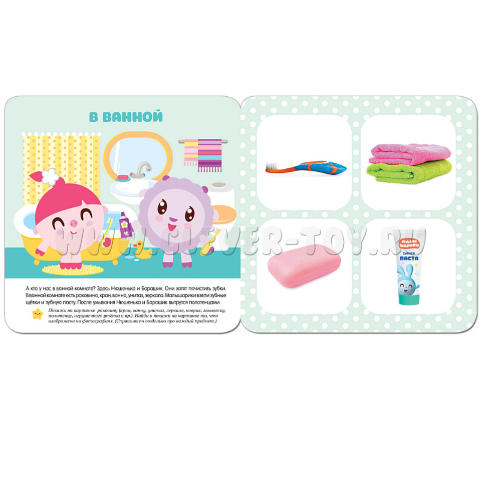 Центральные странички книги выполнены из плотного картона, с выдавливаемыми картинками, на которых изображены предметы из разных комнат дома. Задача малыша рассмотреть, что там нарисовано, с помощью взрослого найти похожий предмет в своем доме и сказать в какой комнате он может находиться. Для удобства хранения картинок, в книже, на последней страничке, есть специальный конвертик.