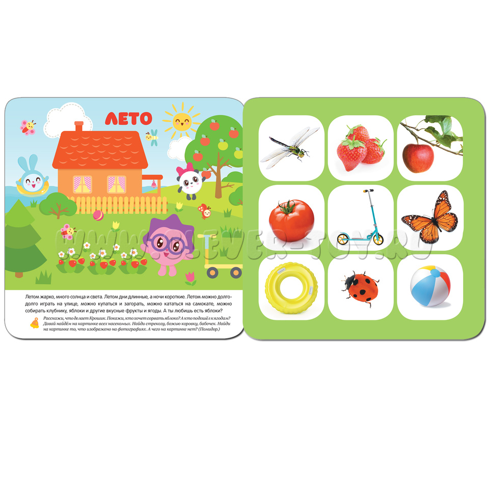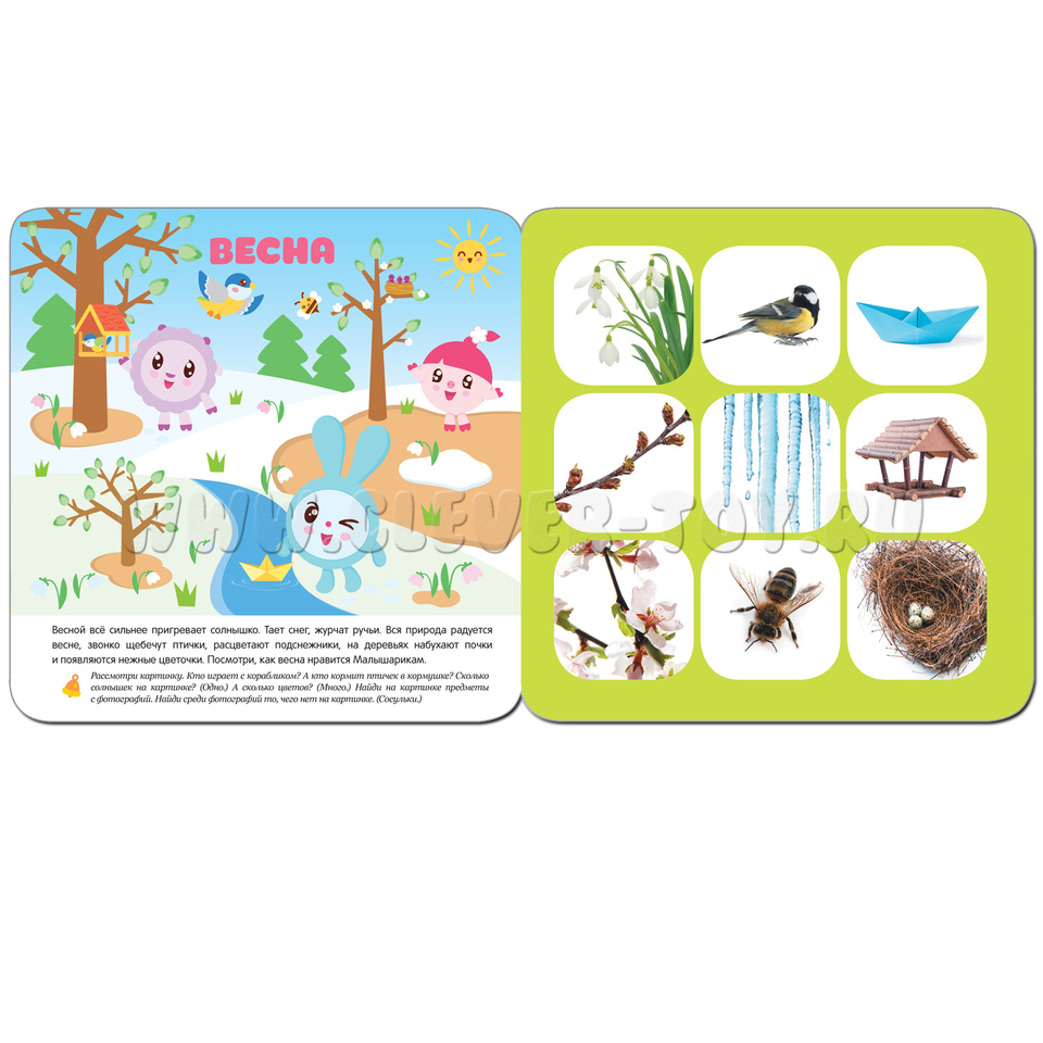 Яркая книжка с Малышариками, короткими и ёмкими рассказами о временах года, с красивыми иллюстрациями и интерактивной картонной вкладкой для увлекательных занятий с ребенком. Именно в этом возрасте у ребенка формируются представления об окружающем мире, о природе и погоде.