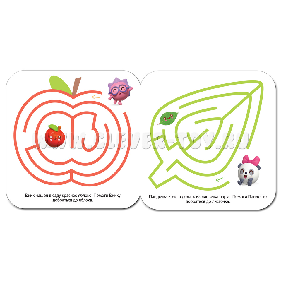 Герои книги – забавные Малышарики - подготовили для вашего ребенка увлекательные задания с лабиринтами: Пандочка хочет полакомиться спелой малиной, Барашик хочет отведать грушу, Ёжик – сорвать лесной орешек, Нюшенька – собрать красивый букет.