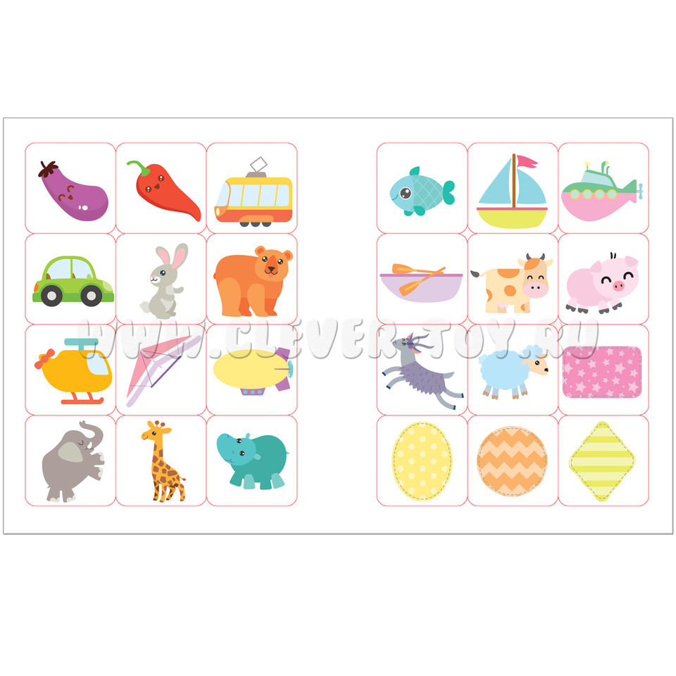 - тематические задания (овощи, наземный транспорт, лесные звери, воздушный транспорт, экзотические животные, домашние животные, геометрические формы, фрукты, насекомые, игрушки, сладости);