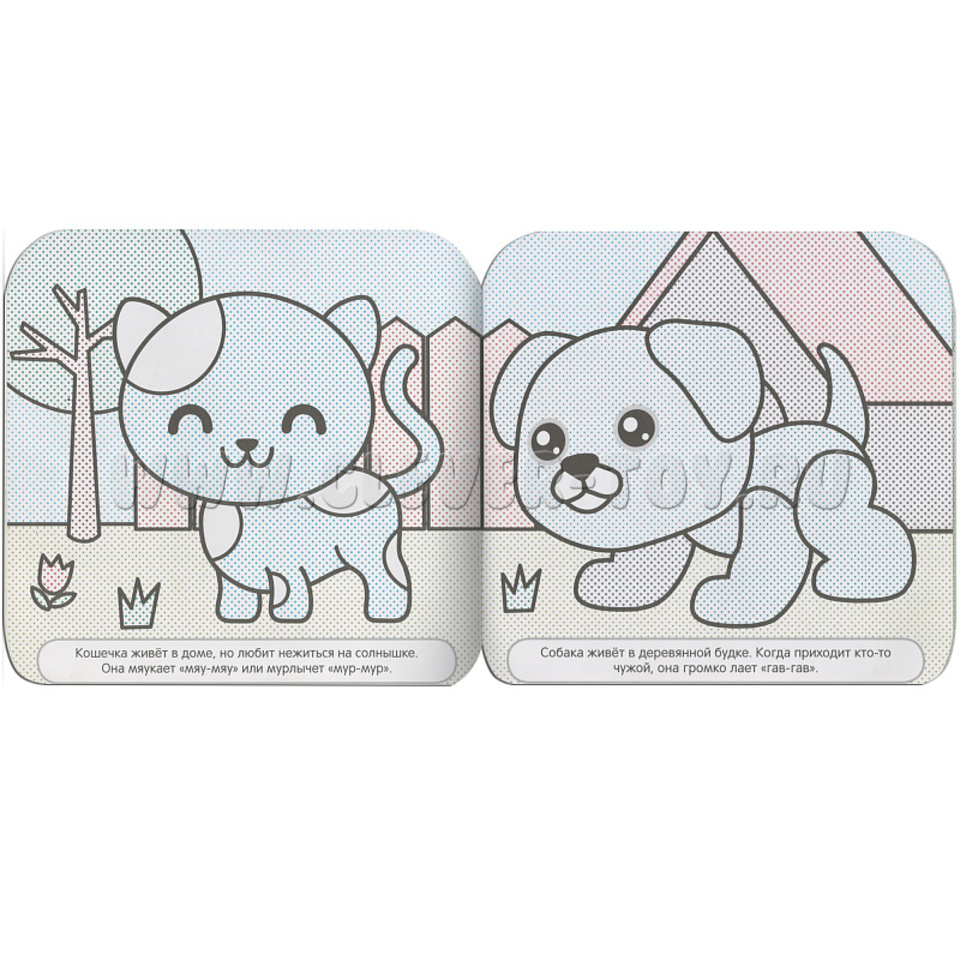 Книжка состоит из 6 толстых страниц, но прежде чем перевернуть раскрашенную страничку, дайте ей подсохнуть. Задача этой серии развить мелкую моторику и познакомить малыша с окружающим миром.