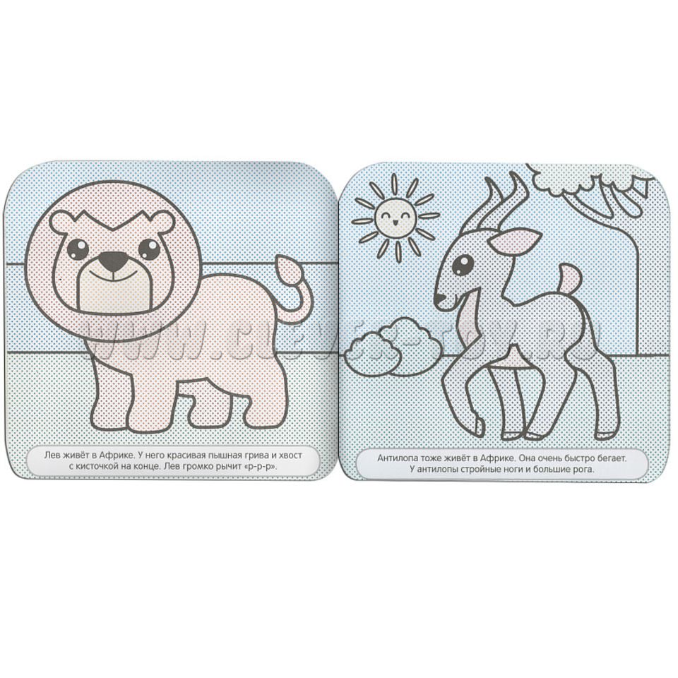 Развивающая книжка раскраска мгновенно заинтересует малыша. На каждой страничке изображено экзотическое животное и стишок про него. Что бы картинки стали цветными, необходимо просто намочить кисть и раскрасить ей лист. Раскраска обладает крупными рисунками и толстым контуром, благодаря этому, раскрашивать будет совсем не трудно.