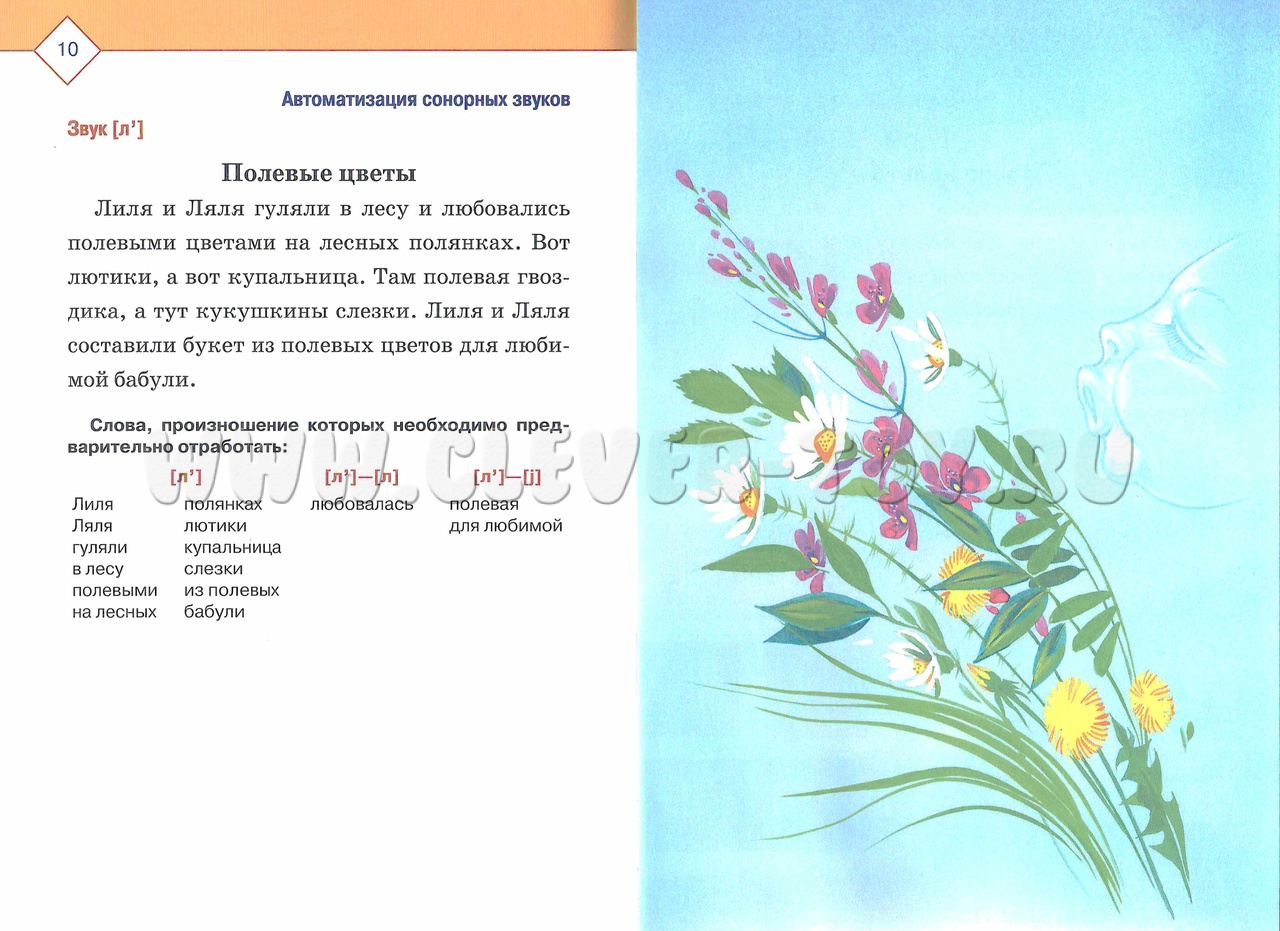 На каждом развороте представлен небольшой текст, наполненный словами с необходимыми звуками. Ниже него выделены эти слова, которые следует предварительно отработать. На другой странице представлена яркая картинка, подкрепляющая рассказ.