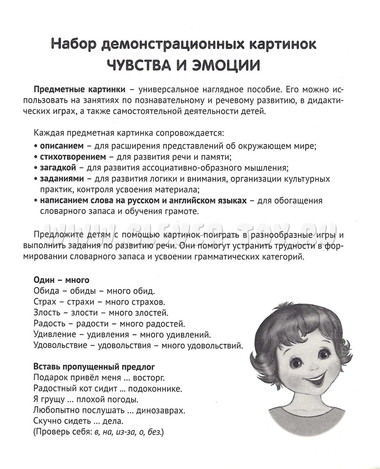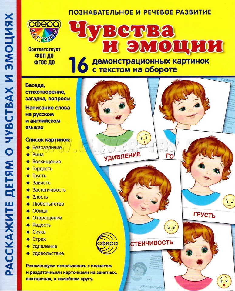 Лицевая сторона карточек украшена красочными иллюстрациями, изображающими различные эмоции человека: радость, грусть, удивление, страх, гнев и другие.