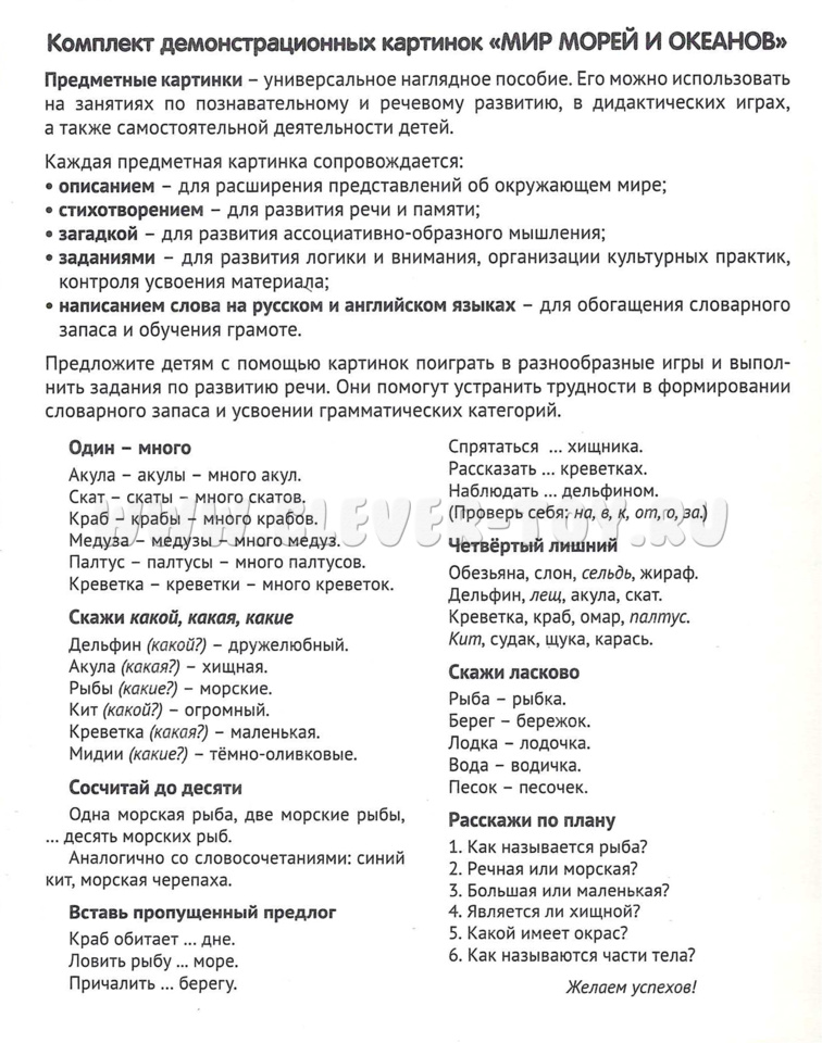 16 демонстрационных картинок размером 22*17,5 см для познавательного и речевого развития. На обороте каждой предметной картинки - описание, стихотворение, загадка, вопросы для ребёнка, название на русском и английском языках.